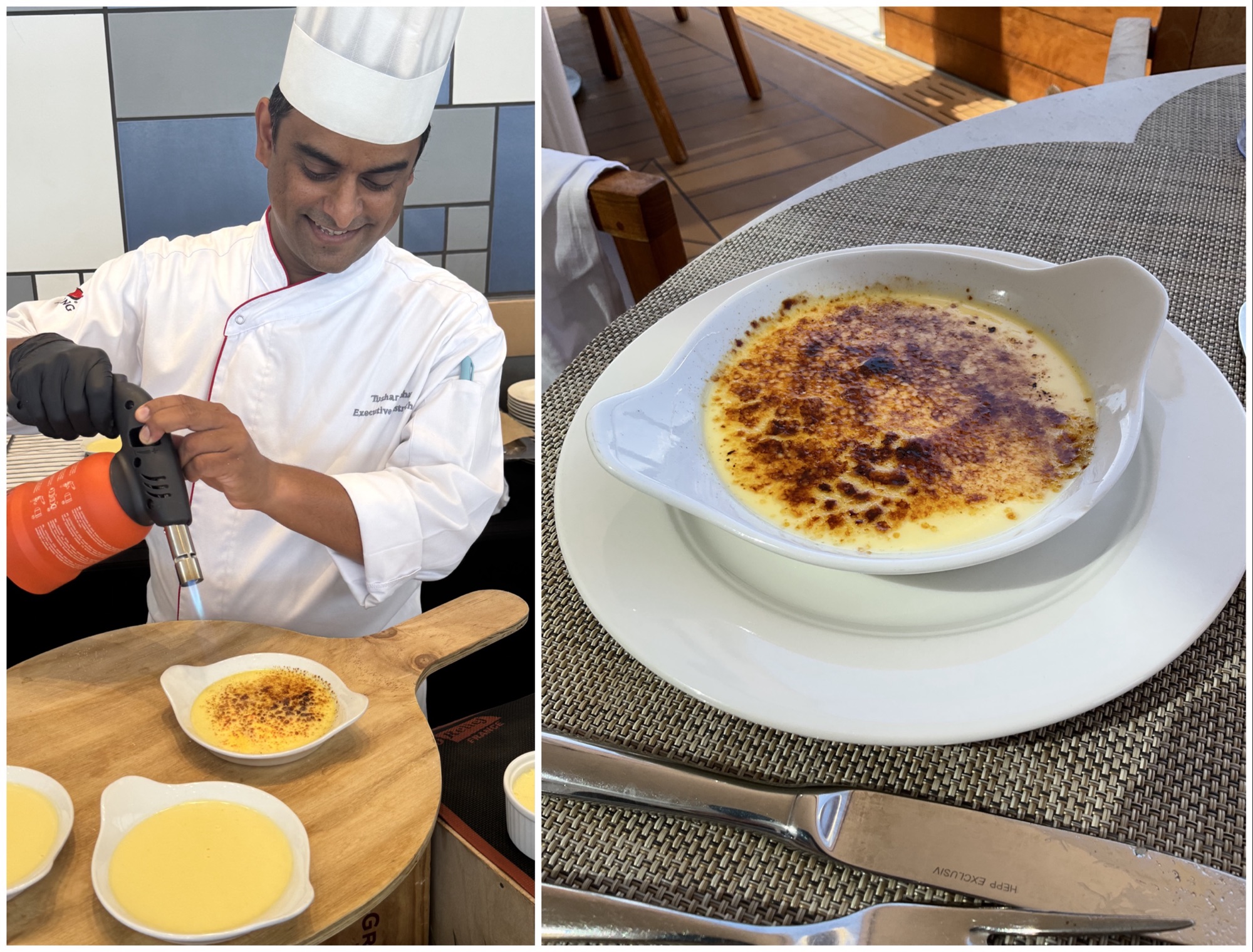 9:15 a.m. I wasn’t ready quite in time for Isaac Kenyon’s early morning lecture about Null Island, so it was 15 minutes in when I got there. Unfortunately the geoscience of the sea bed below Null Island wasn’t holding my interest, so I headed for a lovely latte in the atrium living room instead. There I just lazed around reading and catching up with fellow passengers until the 11:00 a.m. cooking demonstration in which Executive Alistair Gillott prepared Valencian style paella.