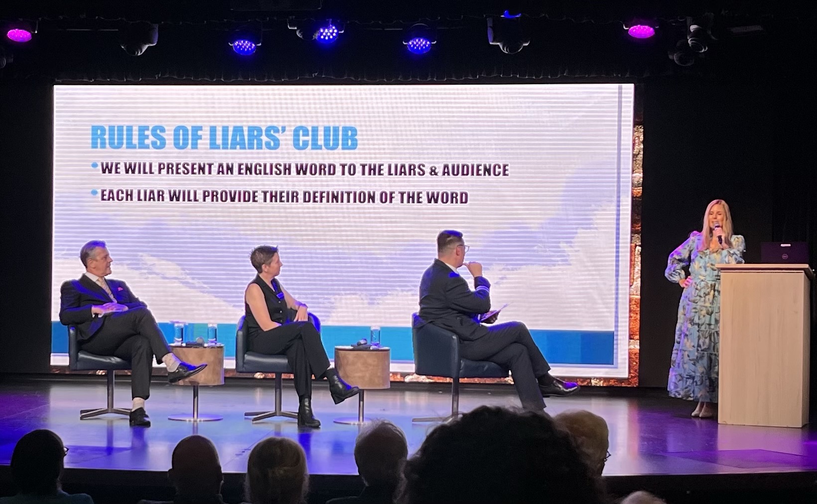 L to R: Guest entertainer Harry the Piano, Resident Historian Caroline Malloy, and Guest Services Manager Nico had us in stitches with their definitions of cachinnate, absquatulate, yerkish, and syzygy. Poor Cruise Director Cornelia was as baffled as we by what the panelists were proposing as definitions.