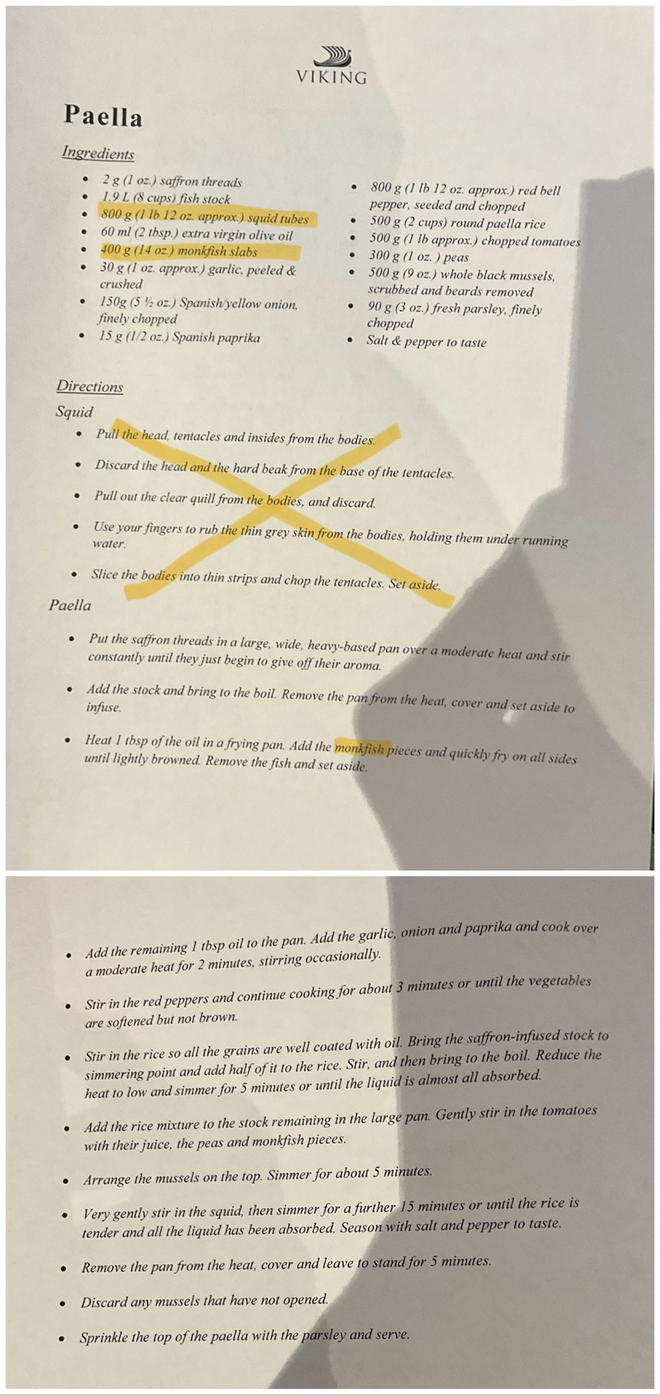 A recipe was handed out to everyone in attendance. Chef immediately said “Get rid of the gross squid and monkfish. Add chorizo, chicken, and shrimp instead. Everything else is the same.”