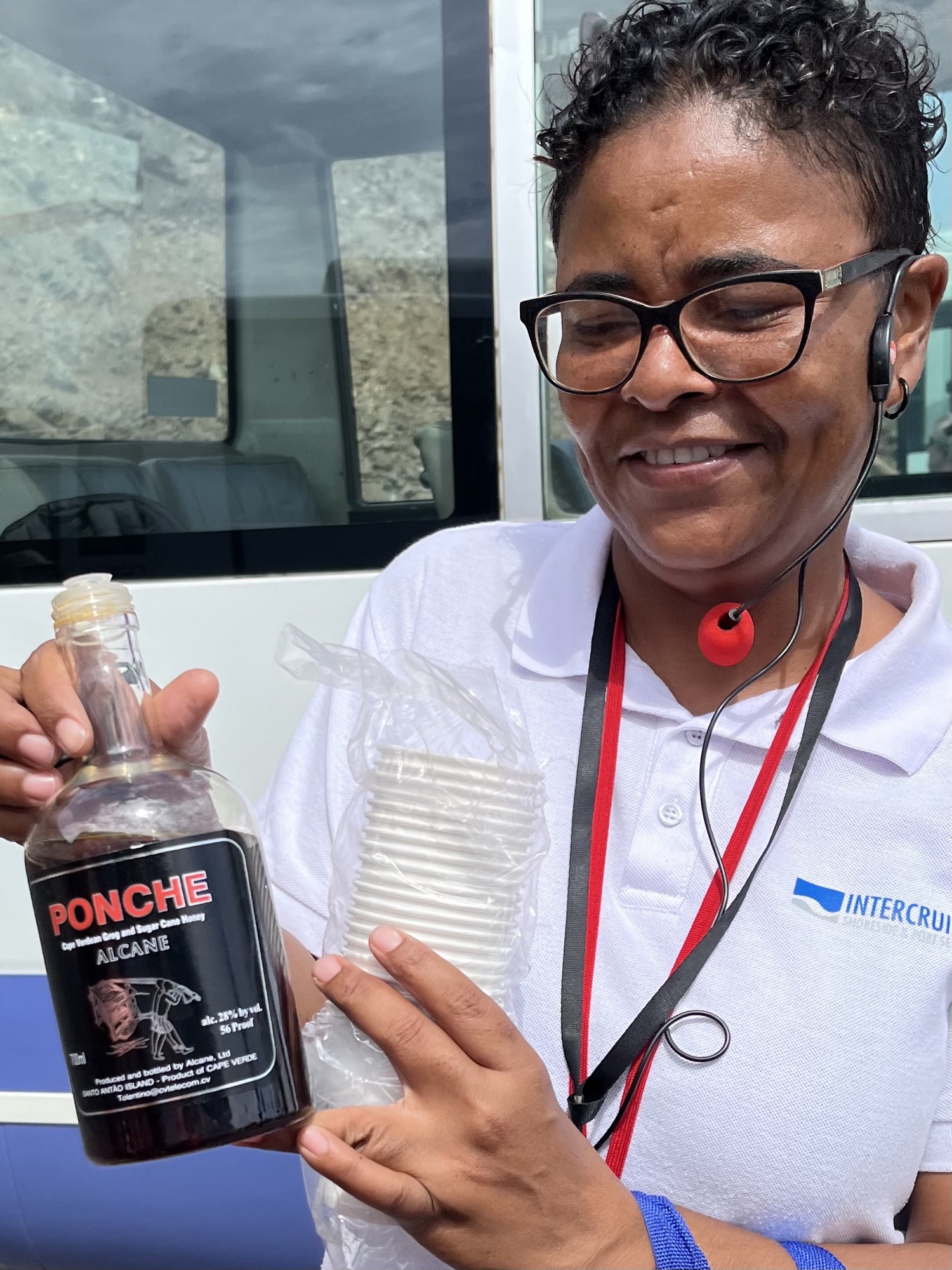 During our stop, we were treated to our first taste of the Cabo Verdean sugar cane Ponche, a strong liqueur that tasted (to me) like peanut brittle without the peanuts – and packing a punch of alcohol. Liliane was quite generous with her pours, so we were all a bit silly on the next leg of our drive. Liliane tried teaching us the chorus of a famous song by Cabo Verdean music icon Cesária Évora, with predictably hilarious results.