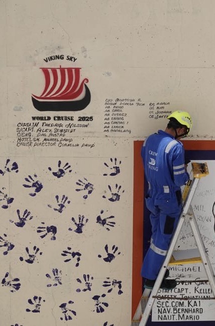 One of the neat things about this port is that various ships have left behind their logos and crew names on the wide cement pillars. Our own was being added today, and once the crew was done, a few lucky passengers got to add their names!