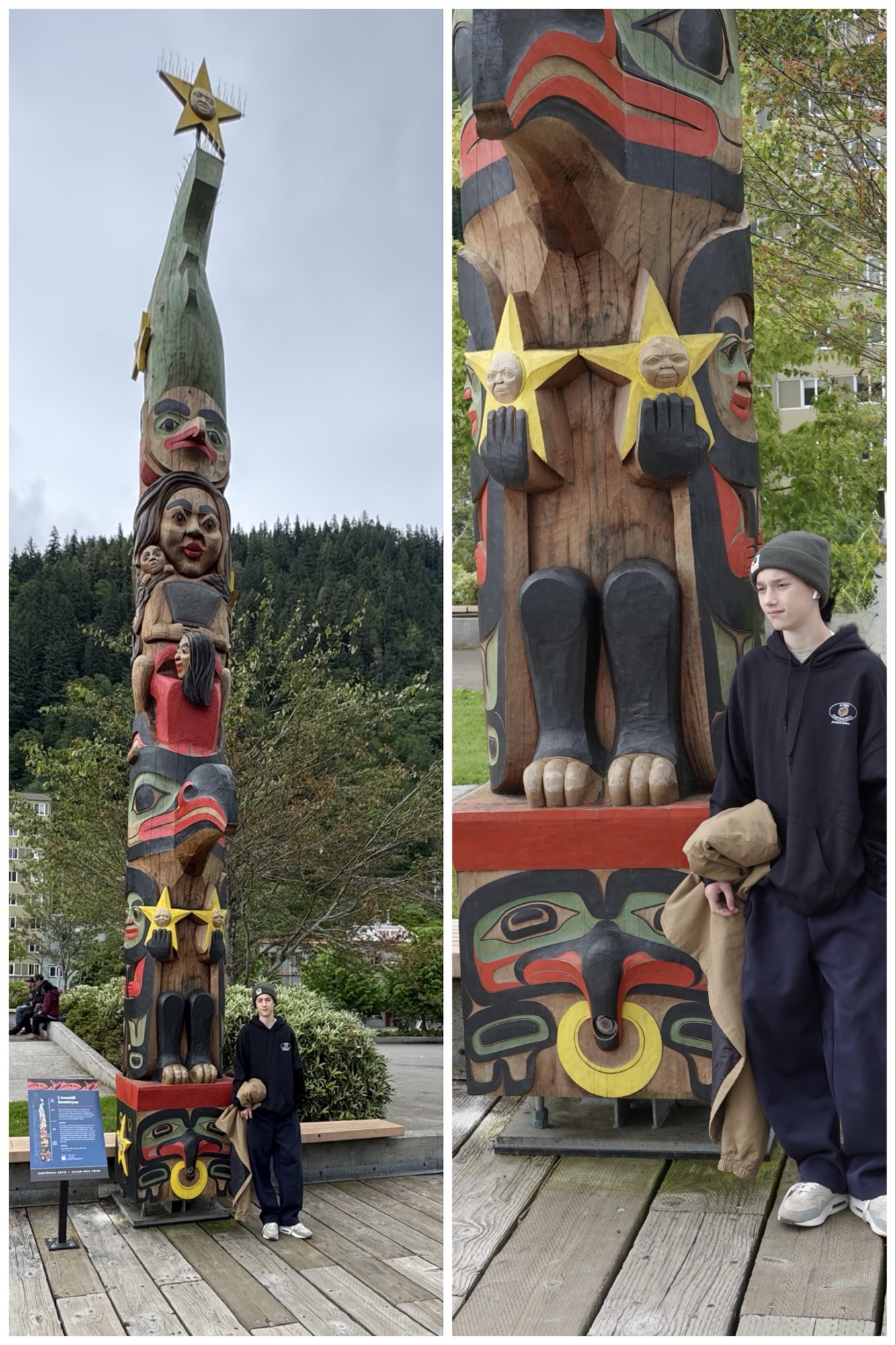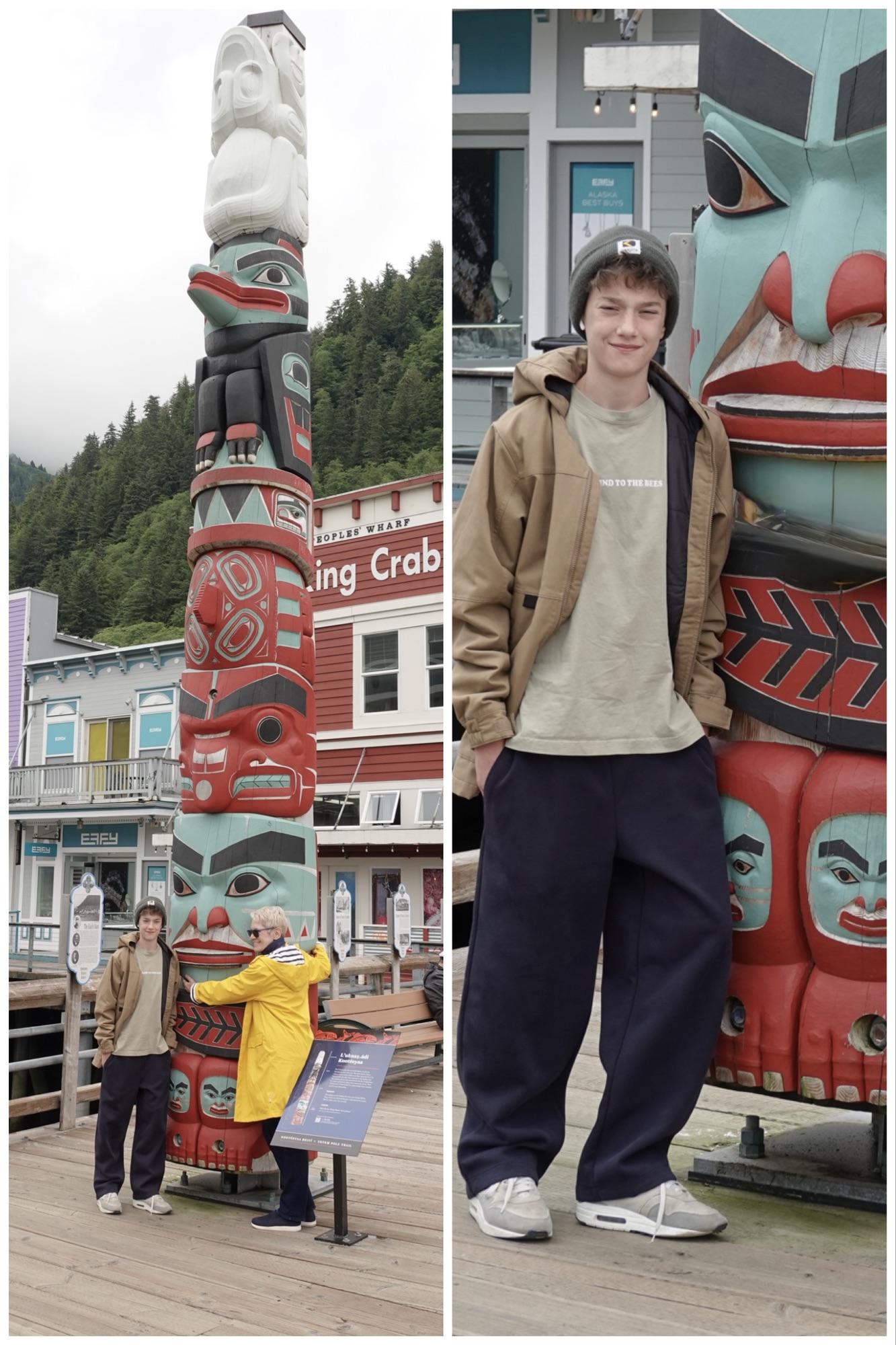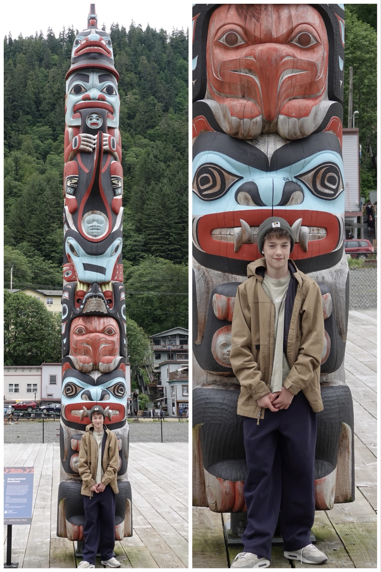 Both before and after our mine tour, because I am a demanding and “problematic” gramma, I insisted that #1 have his photo taken beside almost every totem pole we passed.