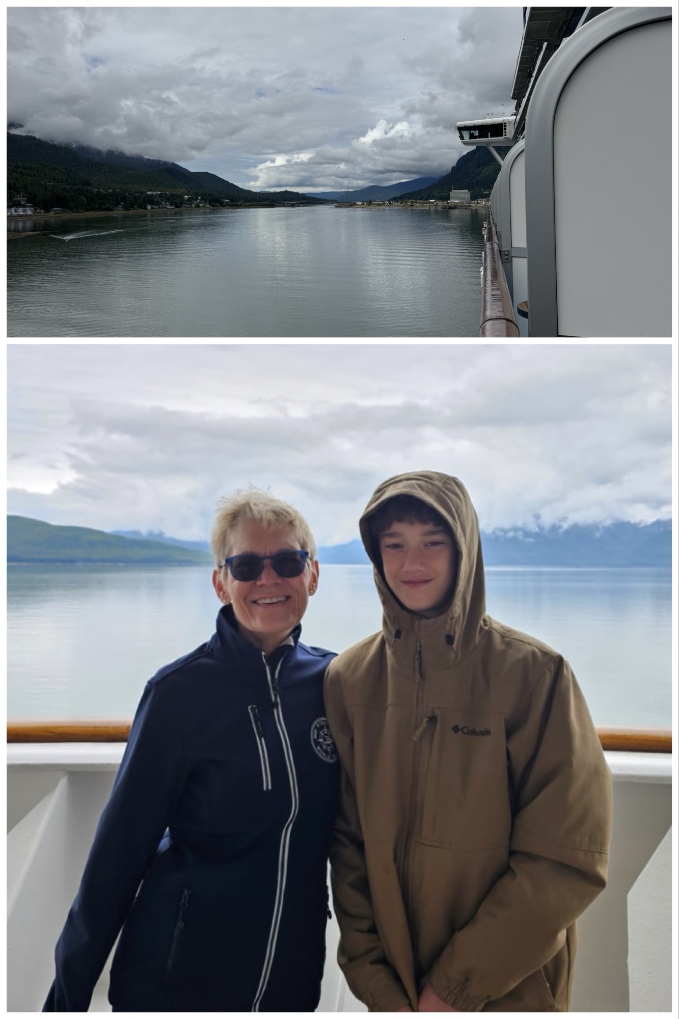While #1 and I were still having breakfast, Ted had gone for a wander around the promenade deck and found the stairs leading to the open bow on Deck 8. Once we heard that, grandson #1 and I grabbed our jackets and headed out to see the view. While attempting a selfie, another passenger offered to take our photo, so we ended up with more than just our faces in the shot.