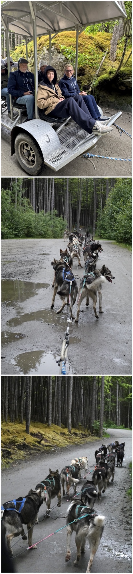 We’d wondered what kind of sled the teams could pull when there’s no snow, and found out that 4-wheeled 8-seat “carts” are used.