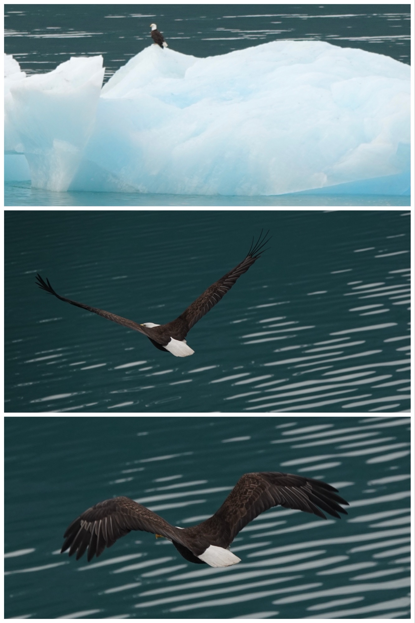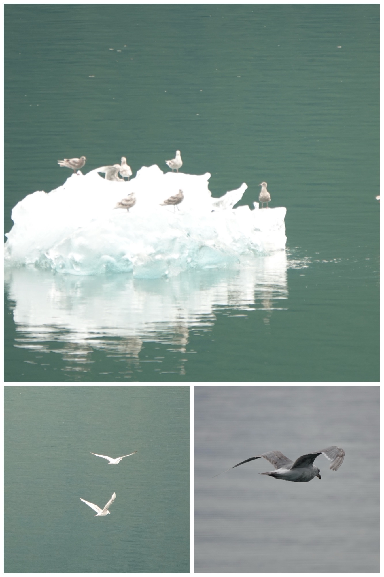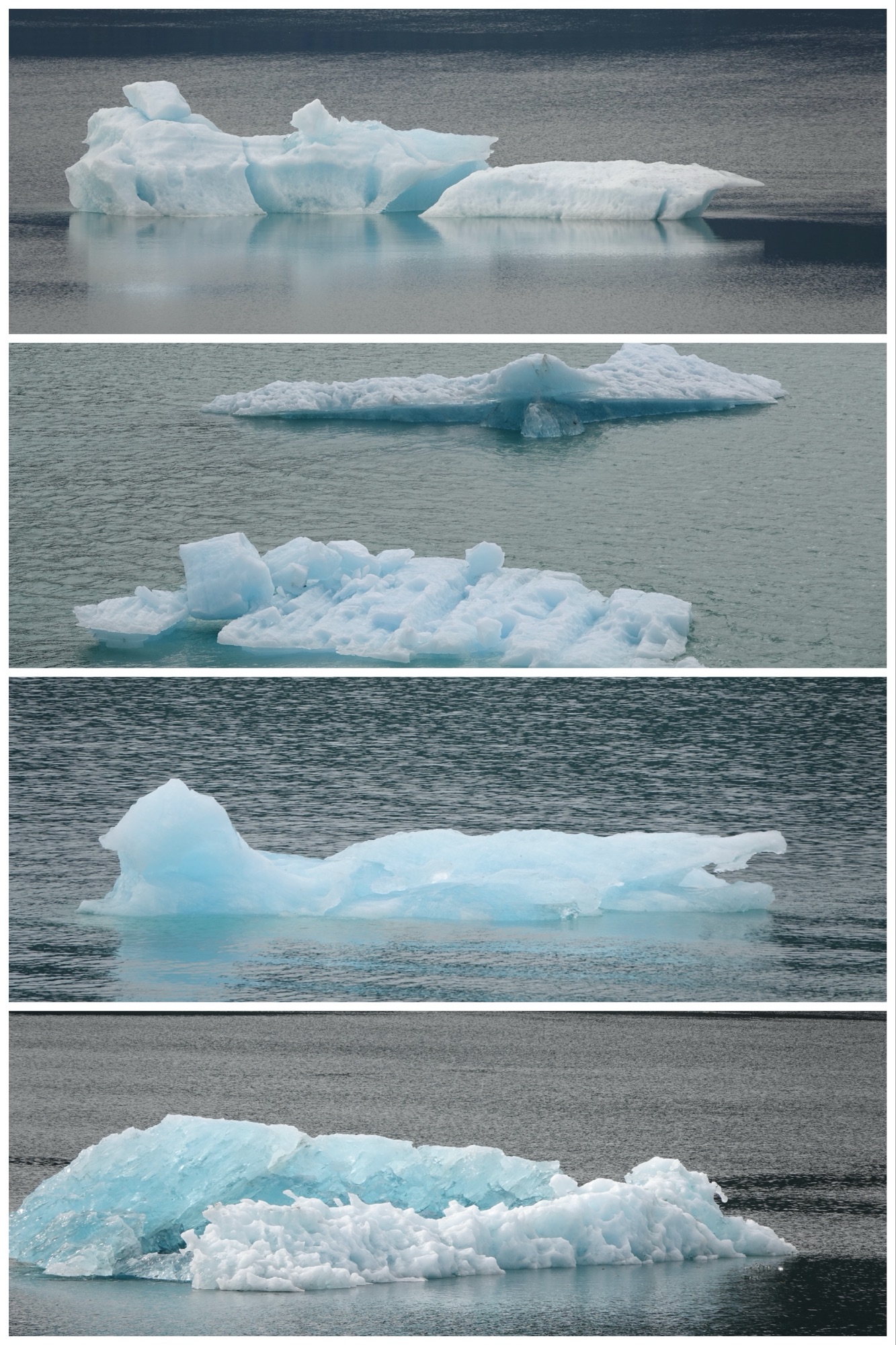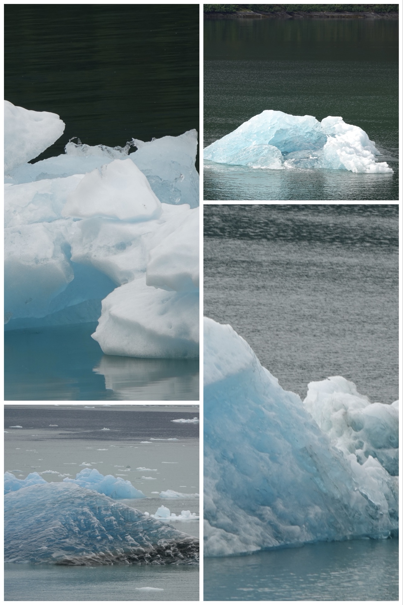 The waters were the typical vibrant green of glacial run-off, and the growlers and bergy bits translucent turquoise. Growlers are small pieces of ice, typically less than 3 ft/0.91m high and less than 215 square feet/20 square meters in area; bergy bits are larger, generally between 3 and 16 feet/0.91 to 4.9 m high and cover an area of roughly 1,000 to 3,000 sq ft/93 to 279 sq m.