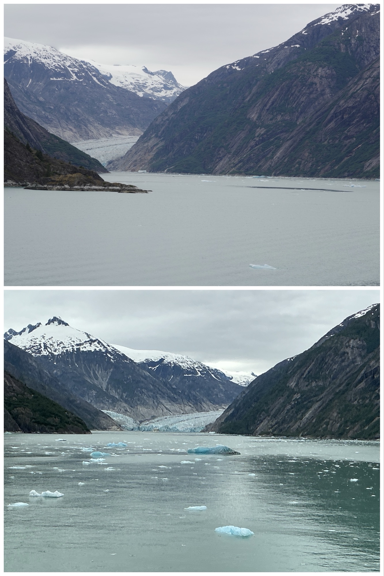 The ice of the Dawes Glacier itself was also bright turquoise under a layer of pale grey embedded rock.