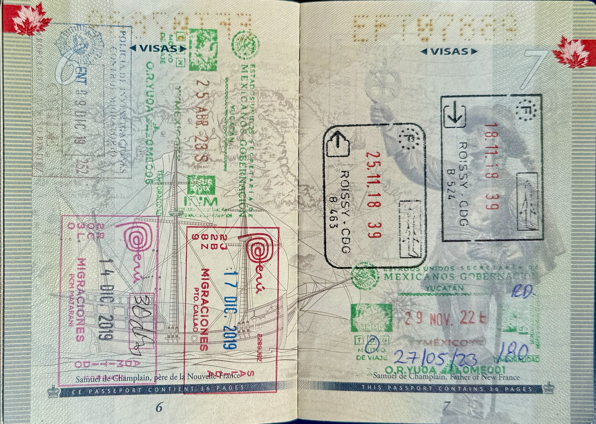 Page 7: Charles deGaulle airport entry 18 Nov 2018 and exit 25 Nov 2018, bookending our Paris to Normandy Viking river cruise with son #1 and their wife; Mexico entry 29 Nov 2022 beginning our allowed 180 day stay in Mérida.