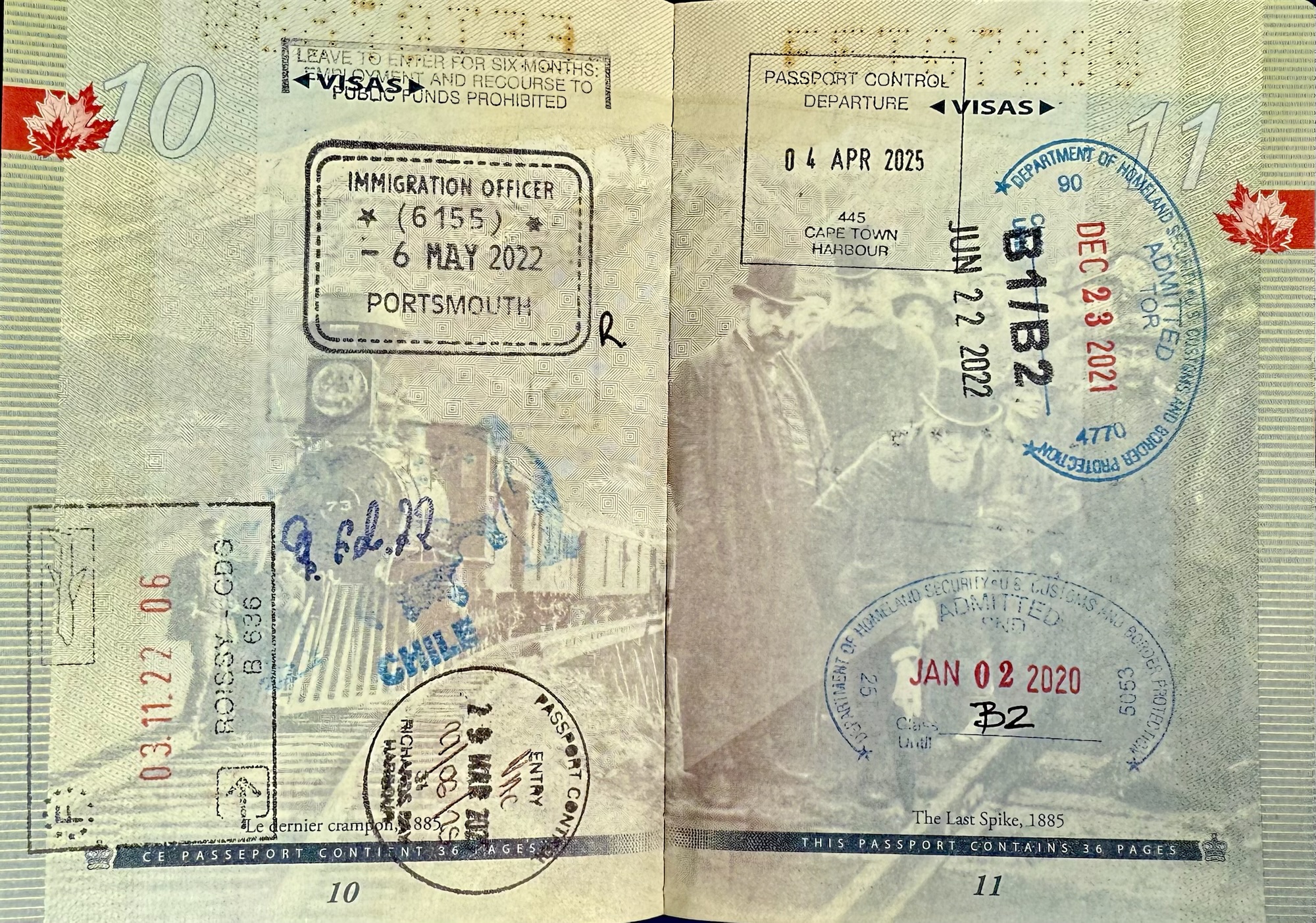 Page 11: leaving Cape Town South Africa 04 April 2025; entering the USA dec 23 2021 on a B1/B2 six month visitor visa at the beginning of our 21/22 world cruise; re-entry to the USA via San Diego on Jan 02 2020 (note that the US is the only country using this date format) after our 2019/20 South American cruise.