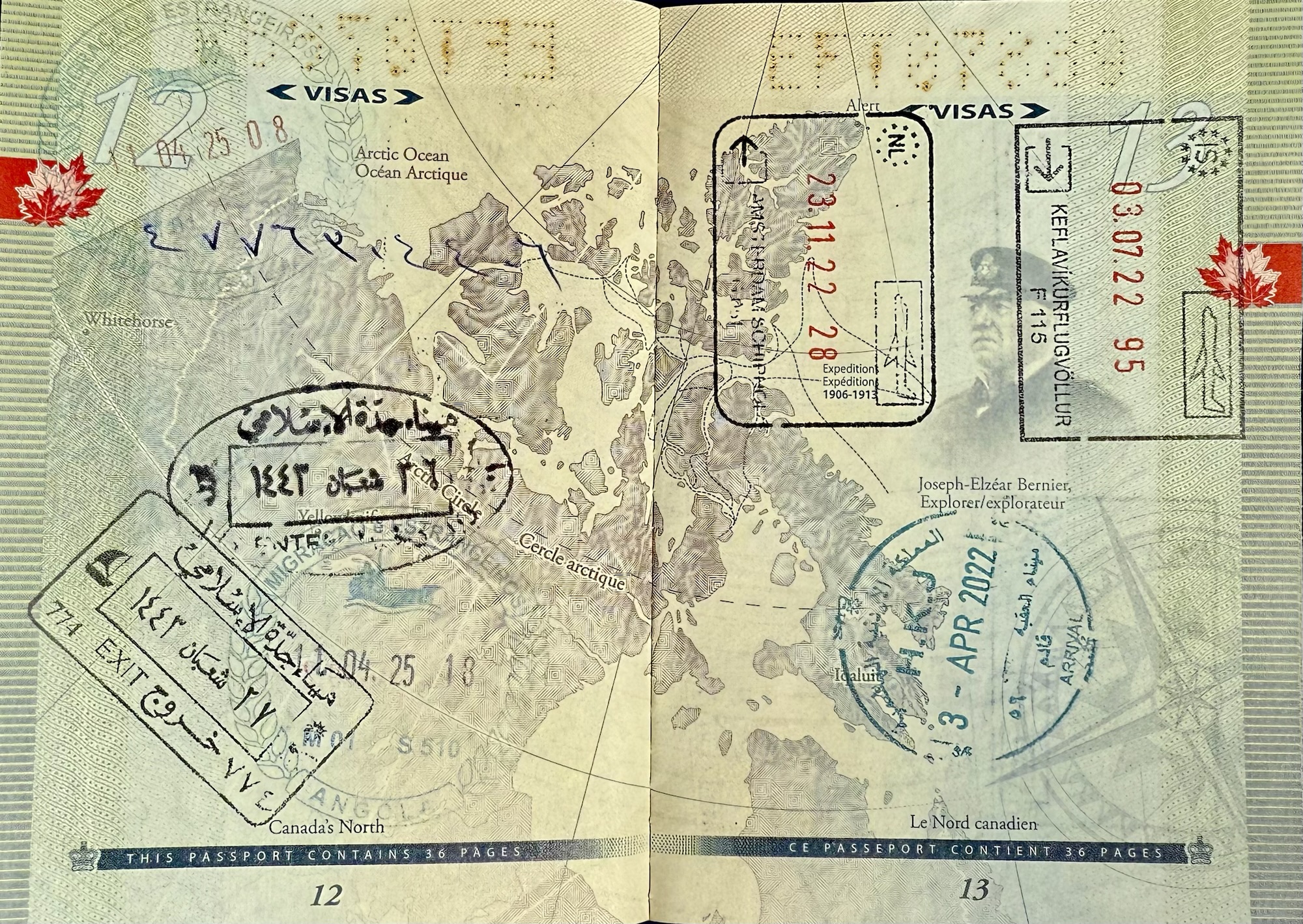 Page 13: entry and transit through Keflavik airport in Iceland 03 July 2022 en route to Berlin; leaving the Schengen Zone via Amsterdam’s Schipol airport 23 November 2022; entering the Kingdom of Jordan 3 April 2022.
