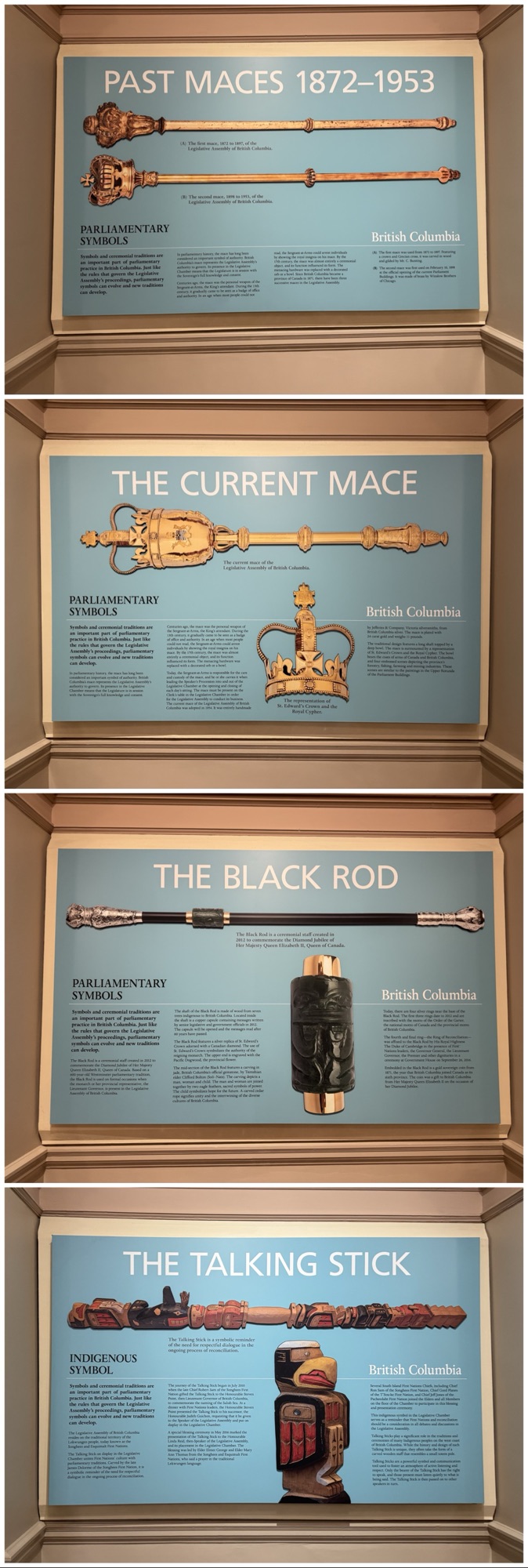 On the lower rotunda walls are explanations of the traditional symbols of government, including a talking stick, as well as a large provincial shield.
