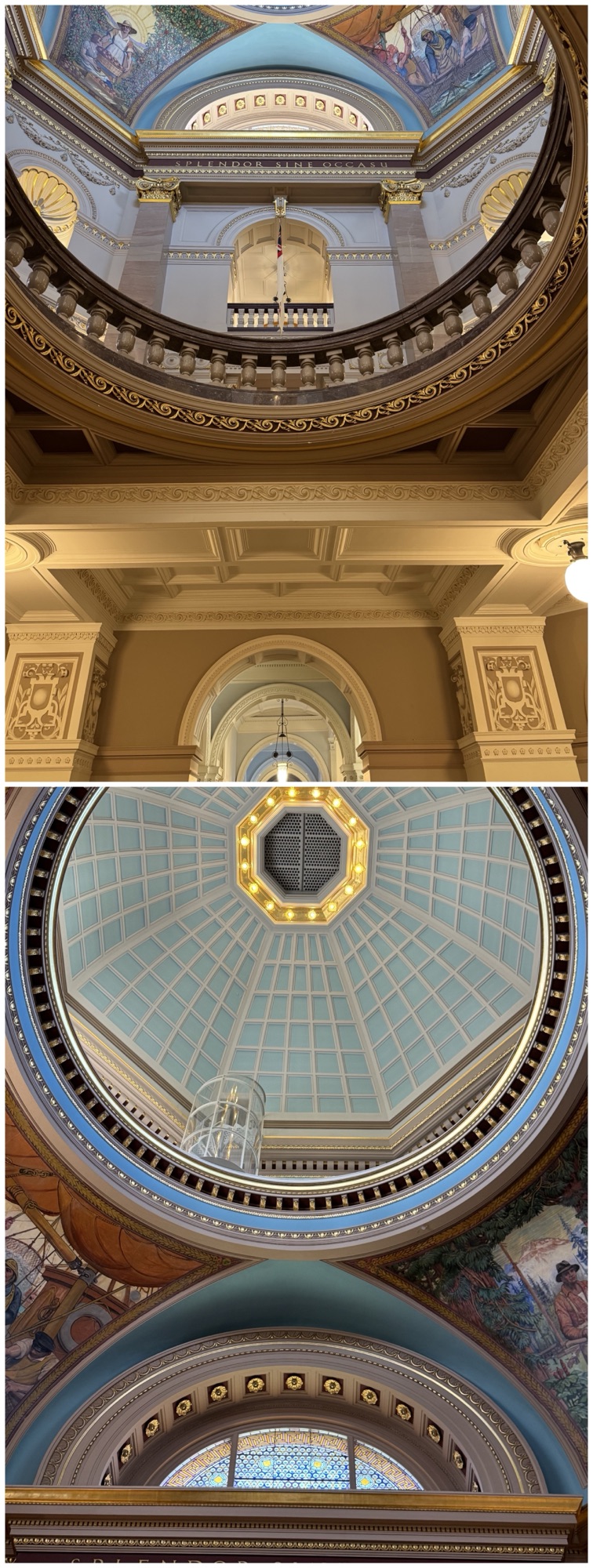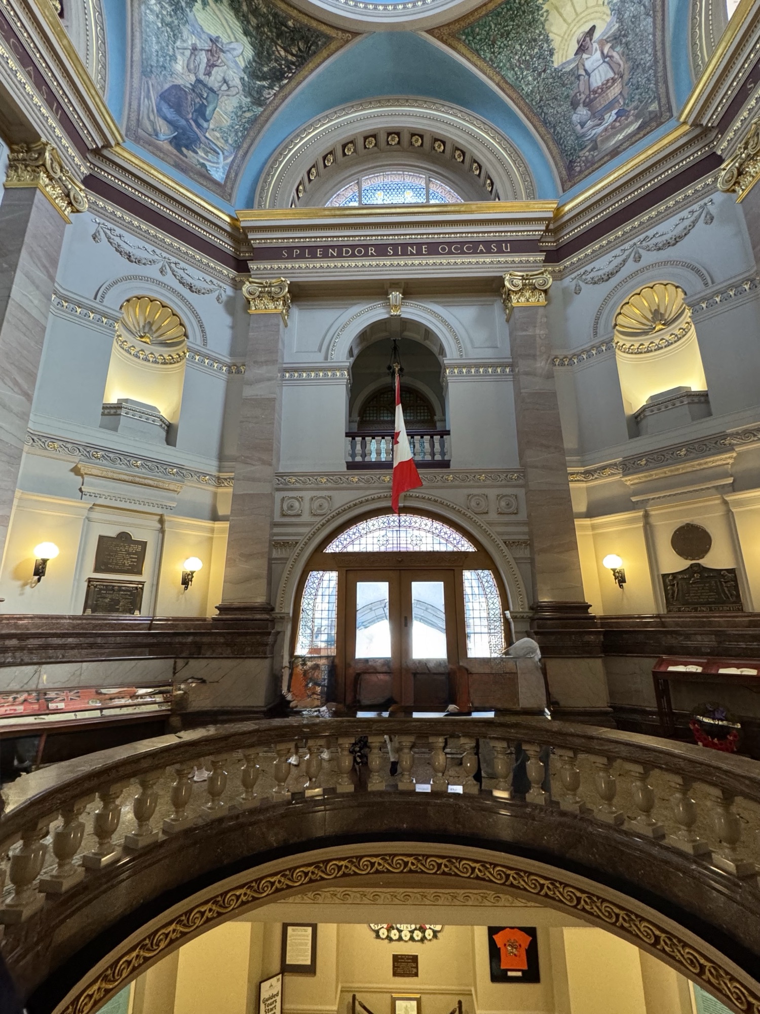 Looking up into the upper rotunda we got a glimpse of the paintings (not frescoes, since they are painted on canvas, not stuccoed walls) depicting BC’s 4 major industries at the time of the building’s construction in 1897: gold, agriculture, fishing, and forestry.