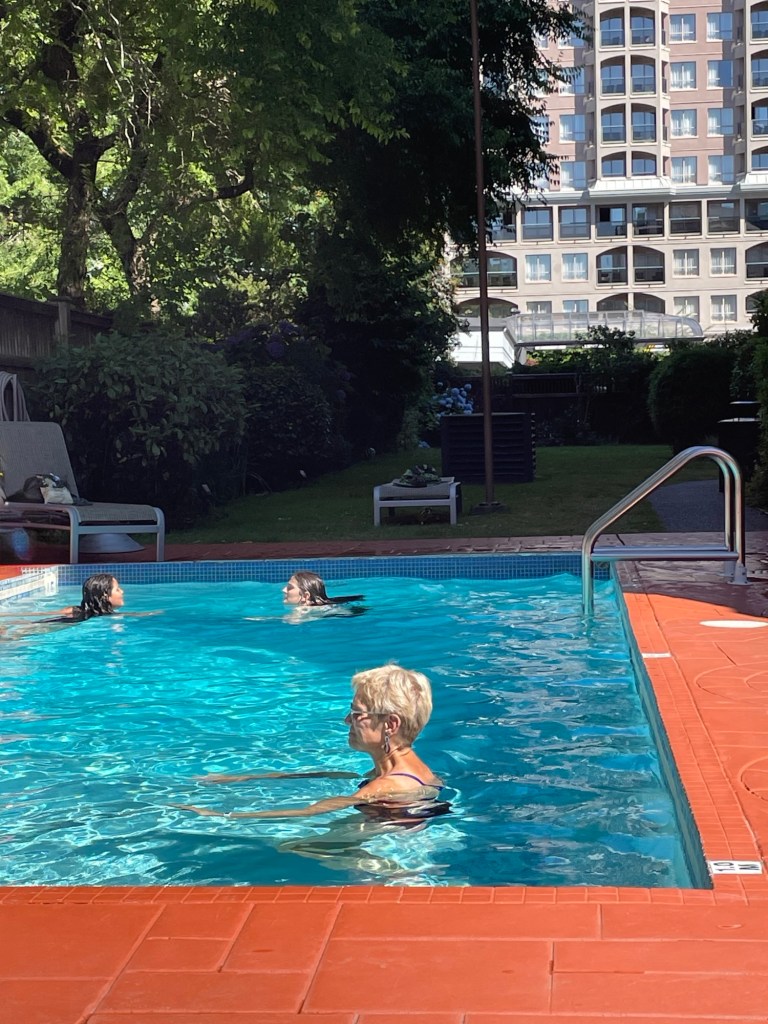 We felt that after our nice long walk we “deserved” an afternoon lazing by the hotel’s outdoor pool, so that’s what we did. (I also “deserved” a double scoop of blueberry cheesecake ice cream from the truck at the harbour; Pat resisted the temptation.)
