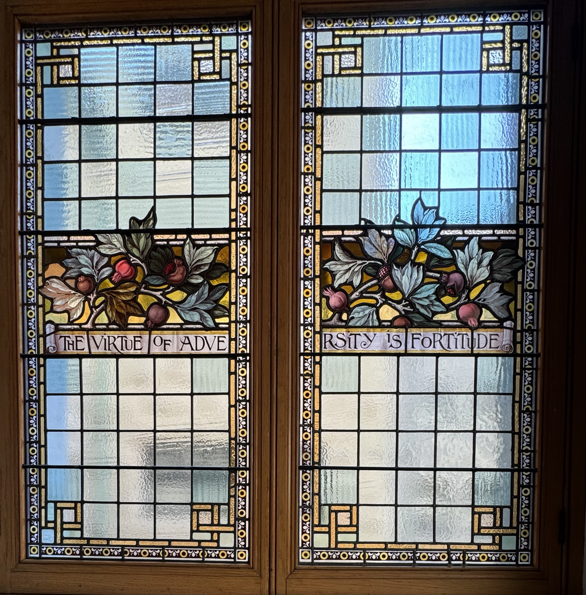 Depicted in the window are the flowers of England (the pink Tudor roses), Scotland (purple thistle), and Wales (yellow daffodil), as well as Ireland’s shamrocks. The controversial element of the window design (created by an English glassmaker in Leeds) is the positioning of the sun above the British flag. During Victoria’s reign, Britons prided themselves on the fact that “the sun never sets on the British Empire”, and yet here was the BC sun “setting” on the British flag. Apparently diplomats present at the window’s unveiling were unamused.