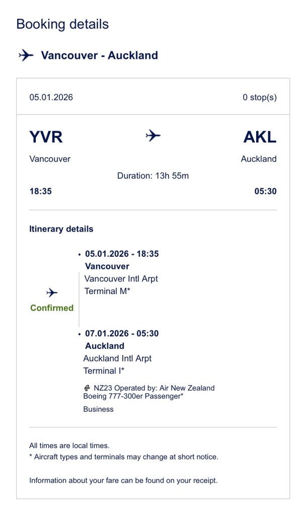ASIDE: Business Class? Why, yes! The entire RTW ticket in Business Class is only marginally more expensive than a round-trip Business Class from Vancouver to Auckland alone. We were both shocked and pleasantly surprised.