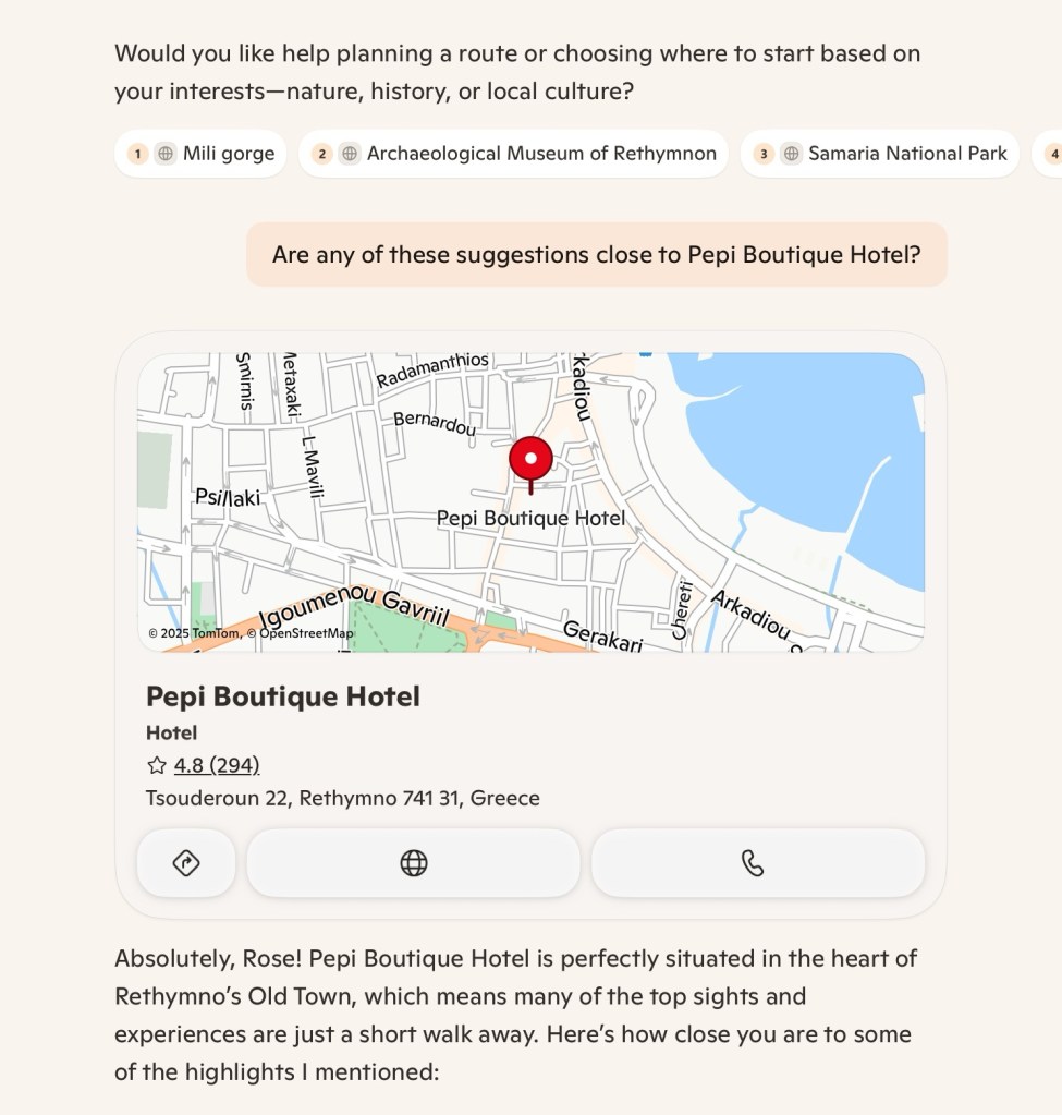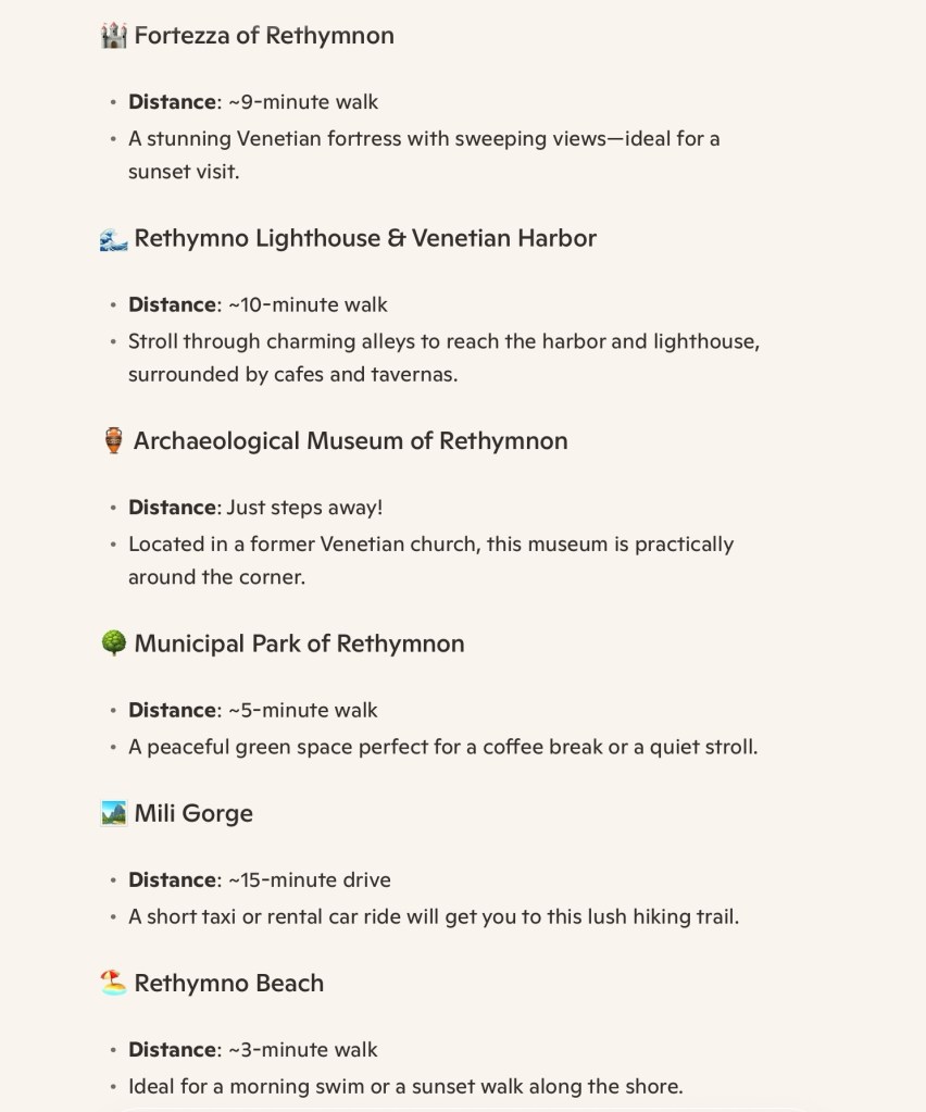 I got back: “Good afternoon, Rose! April is a wonderful time to explore Rethymno, Crete – mild weather, blooming landscapes, and vibrant cultural experiences await. Here’s a curated list of things to do and see, with a mix of nature, history, and local charm:” That was followed by a list of 8 locations, each with a description and map.