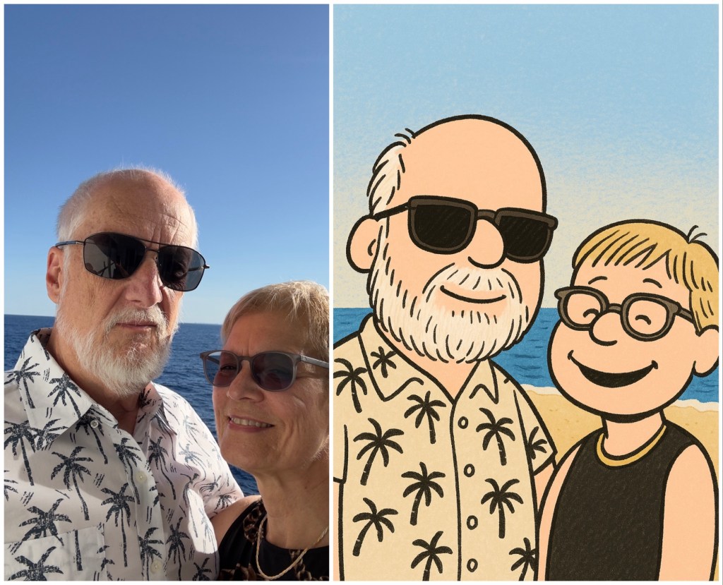 I’ve mainly enjoyed using it to create images, like the one below where I asked it to turn a shipboard holiday photo of Ted and me into Peanuts-style comic characters