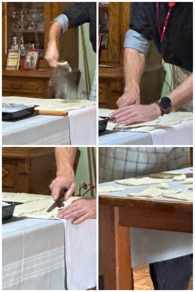 Once the dough had doubled, Miloş floured a cloth work surface on which he used a long wooden dowel to roll the dough to about 1/4” thick. at this point, he would normally just make 2 large strudels, but for us he cut the dough into squares of about 4” x 4” so that we coukd make mini rolls.
