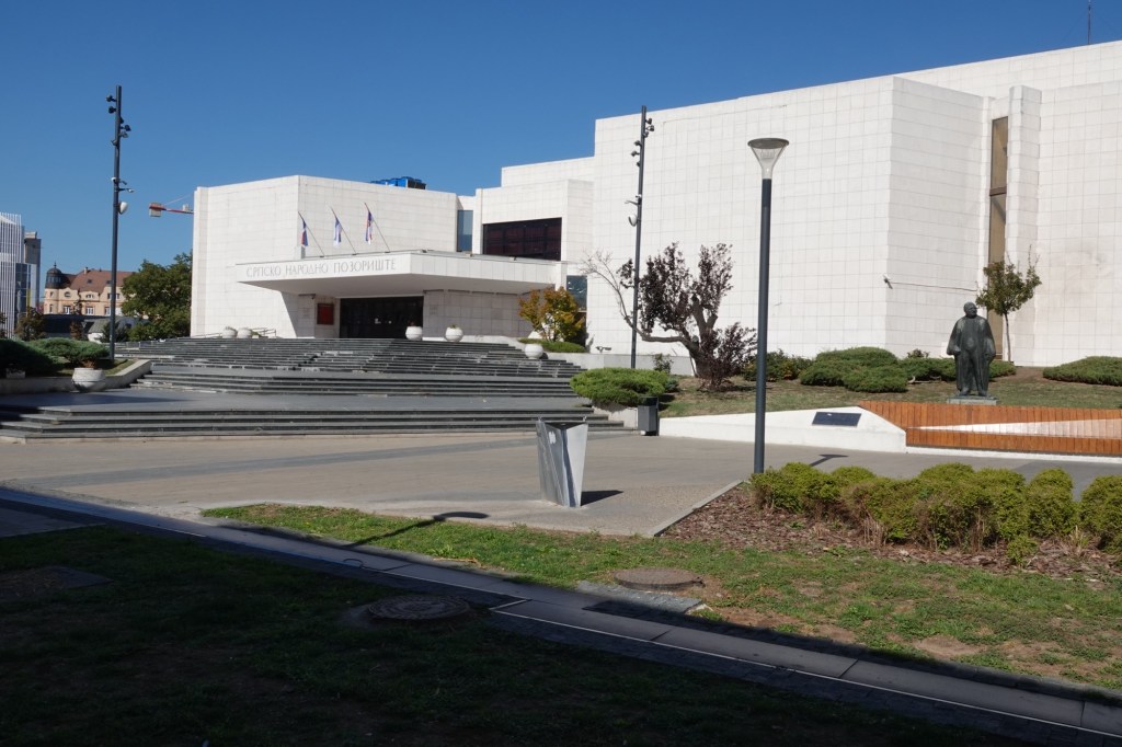 The flags in front of the building are in typical Republican colours of red white and blue. The national flag has stripes and no symbols. The flag with three stars represents northern Serbia; our guide quipped that they are not Michelin stars.