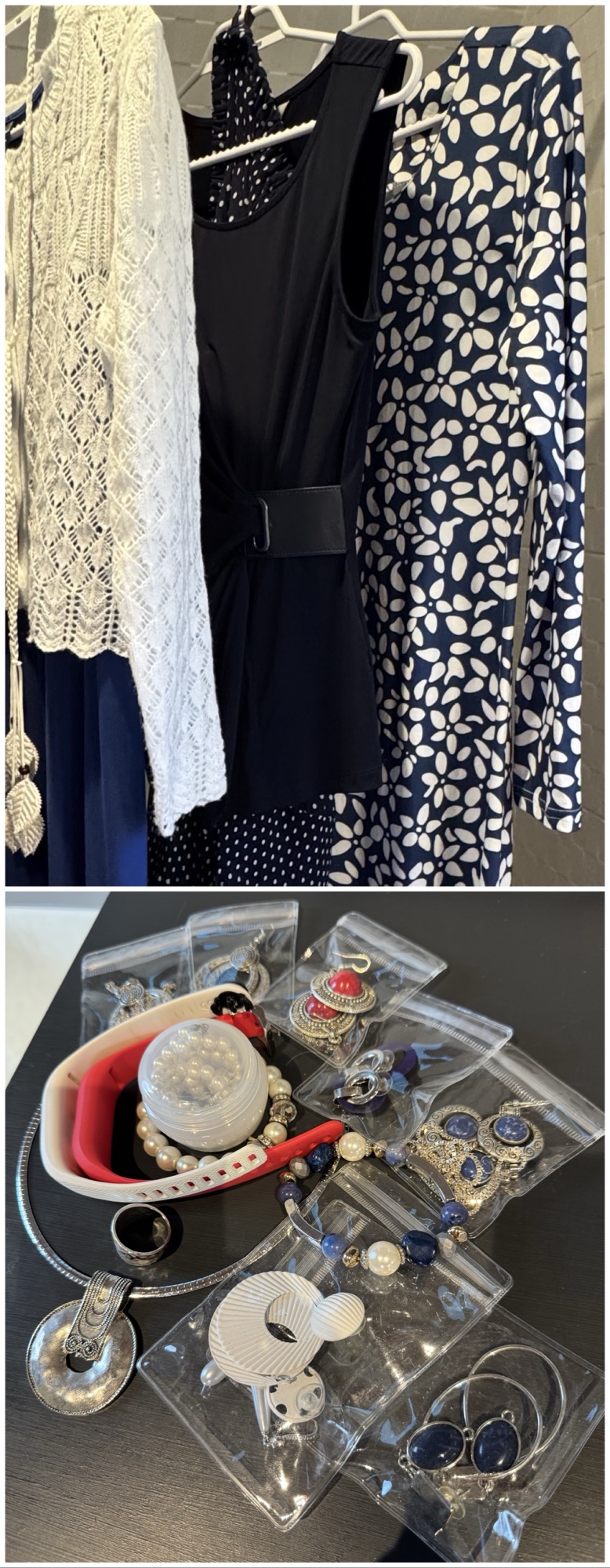 Rose: (for tours) 2 pants, 6 casual long-sleeved tops, sweater/fleece jacket, walking shoes; (for evenings) 1 maxi skirt with 2 tops, 2 dresses, 1 dressy tunic (not pictured), flat dressy shoes. Add underpinnings, a bathing suit and coverup, raincoat and umbrella, kit bag and jewellery, and … done!