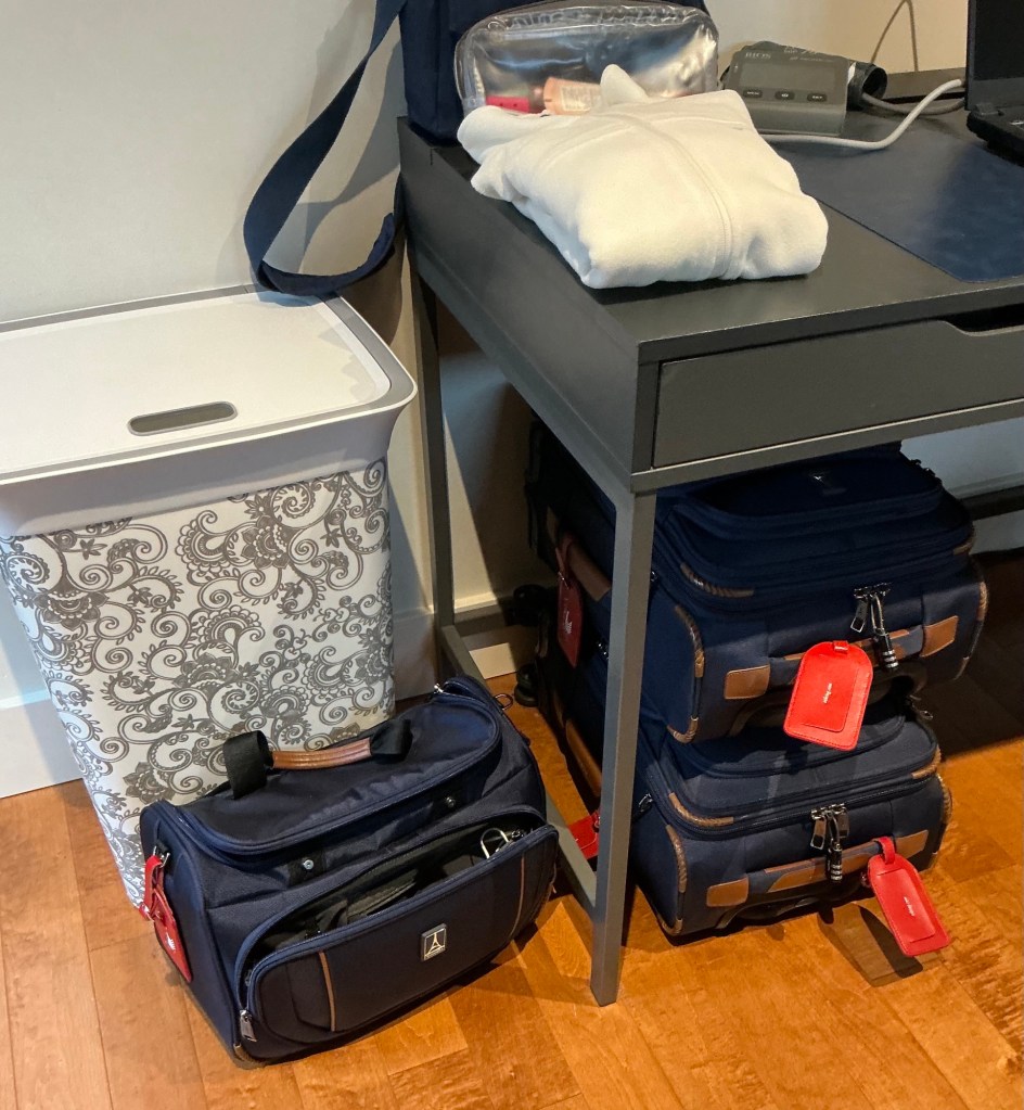 Ted’s extra shoes, our umbrellas, and our kitbags(including medications) will go into our small duffel bag, which never gets checked. Everything else goes into our carryon-size suitcases, which we often choose to check when we have direct flights. It’s nice not to have to wheel them around the airport when we’re waiting for our flight and, in our experience, it’s been during transfers/layovers where we’ve had luggage issues.