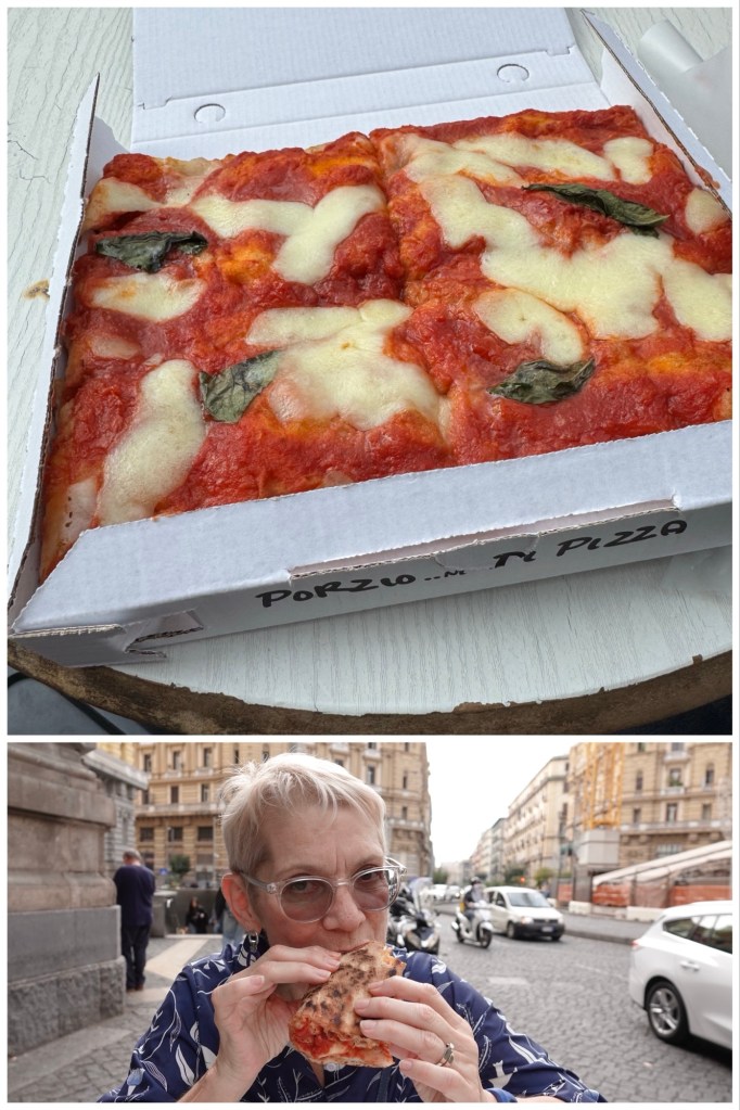 We made a quick stop at a pizza stand being frequented by lots of Neapolitans for a giant slice of margherita pizza. Ironically, although the last royal family of Naples was not particularly popular because they changed Naples from an independent state into part of a “country”with a new flag of red, white and green, the iconic Napolitan pizza is not only the colours of that flag but is named after King Umberto‘s wife Margaret.