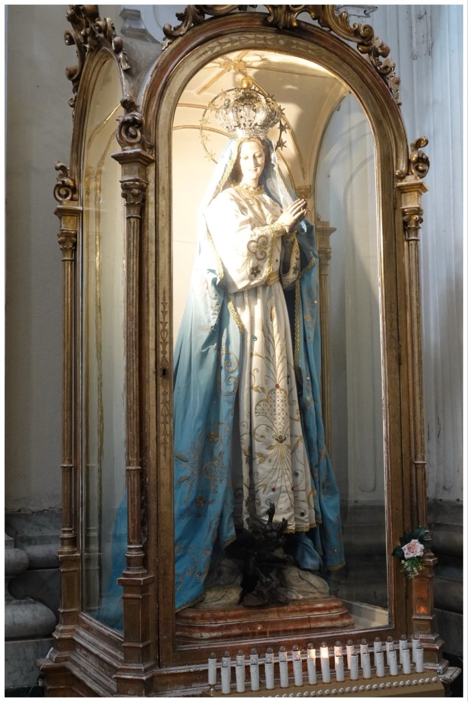 The statues in front of the church are the king of Naples, Ferdinand, and his father King Charles of Bourbon. Each one has in their hand a scroll representing the constitution given to the people; the constitution was never given to the people, but the statues were created this way “just in case”.