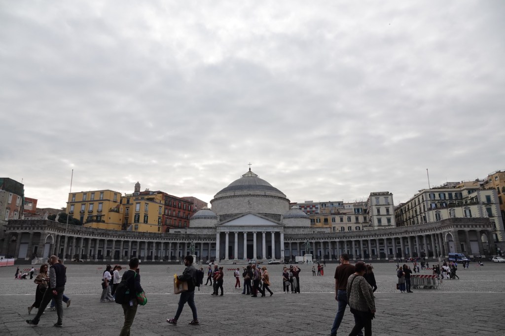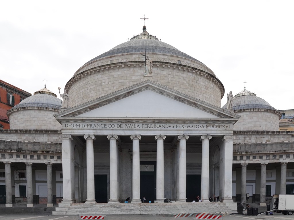 The most important square in Naples, historically speaking, is the Piazza del Plebiscito, with the huge pillared neoclassical church of Saint Francis as its main feature. The style of the church is reminiscent of the Greek Parthenon. When Napoleon conquered Naples, King Ferdinand fled to Sicily, which was not under Napoleonic control. During his exile, he promised God that if he was allowed eventually to return to a free Naples, he would build “a small church”. This massive church to Saint Francis fulfilled his promise to God in 1816 CE.