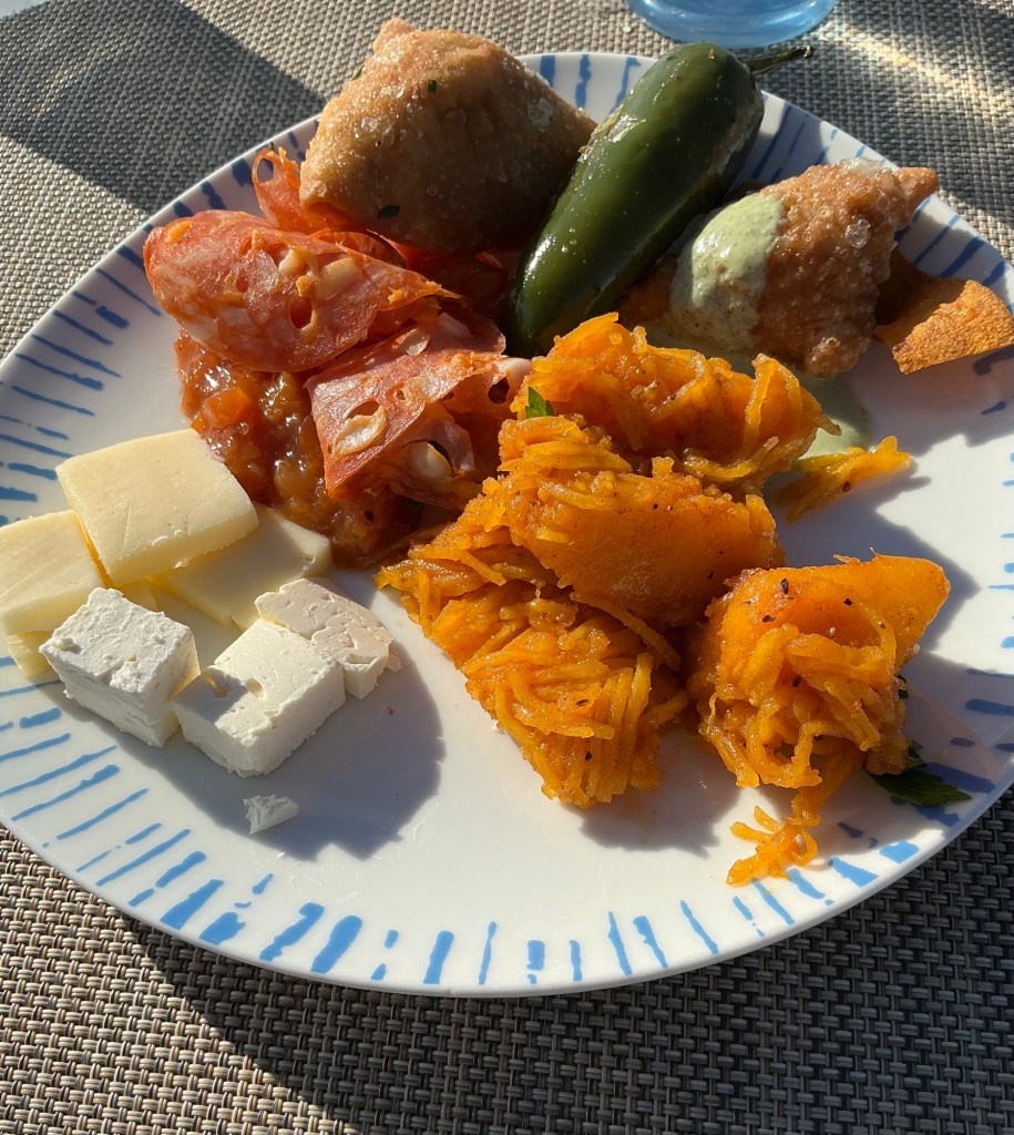 While Ted enjoyed one last Viking burger in the Pool Grill, I made up a plate in the World Café and ate almost solo (3 passengers and six staff!) on the Aquavit Terrace. A virtually empty ship meant no competition for the blackened jalapeños that accompanied the vegetable samosas, and being able to score a couple of big chunks of the apricot garnish on the amazing apricot gelato!