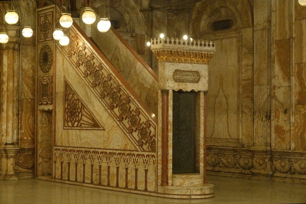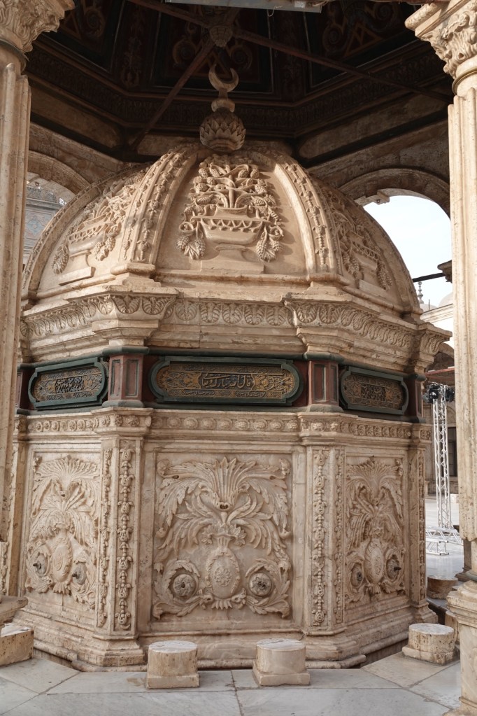 The mosque we’re visiting within the citadel only dates to 1830-1852, and is named for Muhammad Ali, who was installed as King of Egypt and Sudan by the Ottomans to replace the previous ruler who was supportive of Egyptian independence. While the mosque is officially the Muhammad Ali mosque, it is also known as the citadel mosque and the alabaster mosque, the latter for its stone interior.