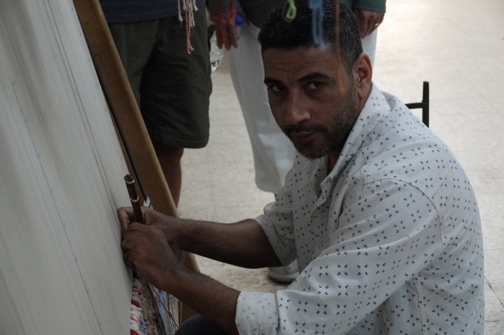 From the Sakkara Complex we drove to the Sakkara Carpet Weaving School, where the students range in age from from nine to twenty. The primary school students work with wool (from New Zealand); the middle school students work with Egyptian cotton and bamboo; and the senior students work with Chinese silk. Not only is there a gradation in materials, but in number of knots ranging from 100 in wool for the youngest students to a maximum of 1225 knots per square inch by an experienced artisan in silk!! There were young students here on the weekend, just experienced weavers.