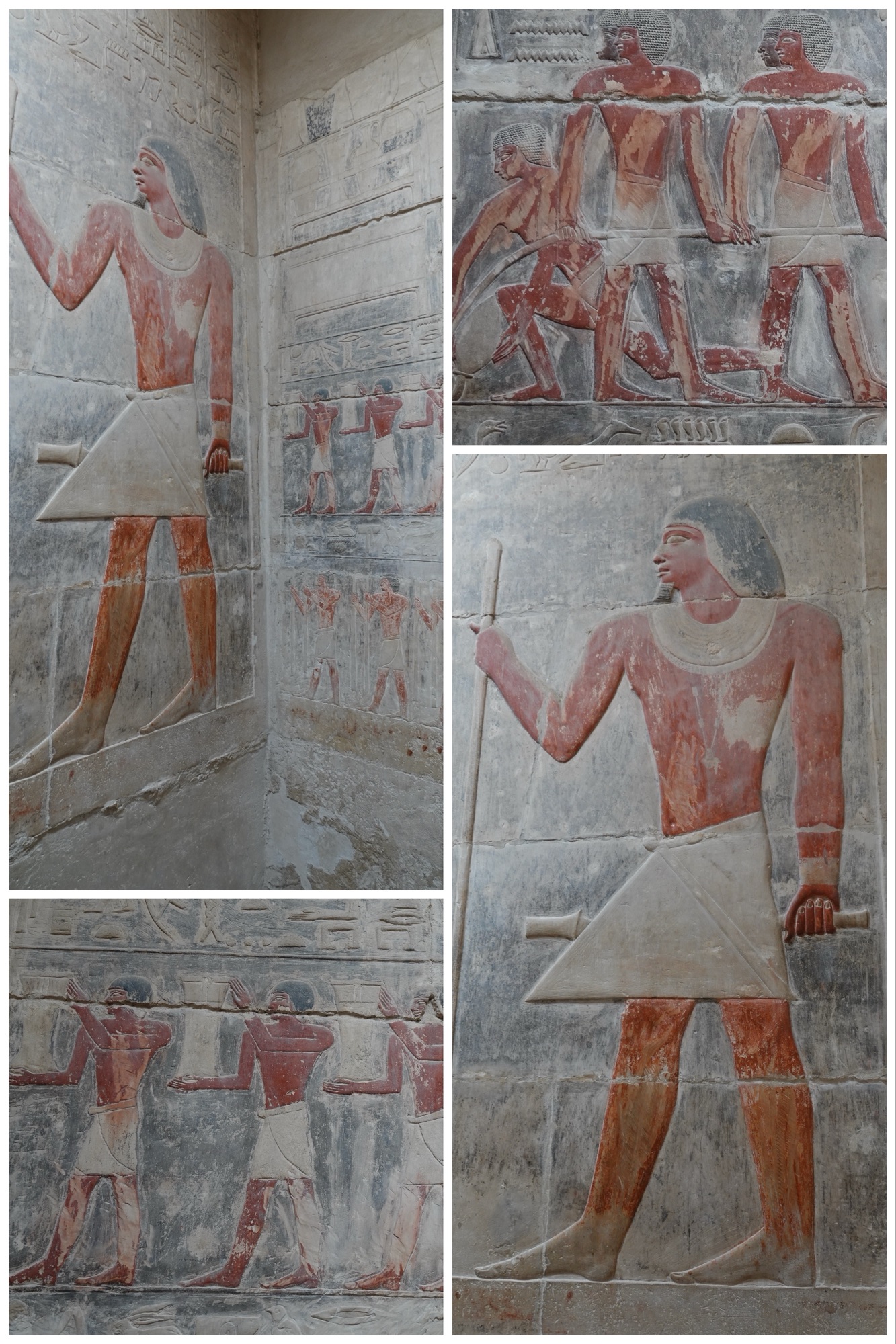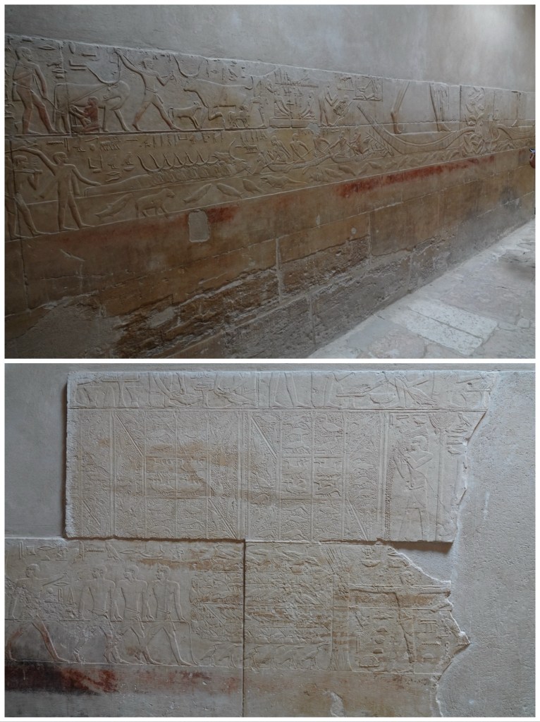In the rooms peripheral to the actual burial chamber which would originally have contained the sarcophagus and mummy, there is very little – and sometimes no – colour because Kagemni died while the tomb was still under construction, and there was not time to do the final step of hand painting. To modern eyes it is quite beautiful the way it is, but we recalled that ancient sites that we have seen in Greece and Rome, which look today have monochromatic carved surfaces, were also originally very brightly painted.