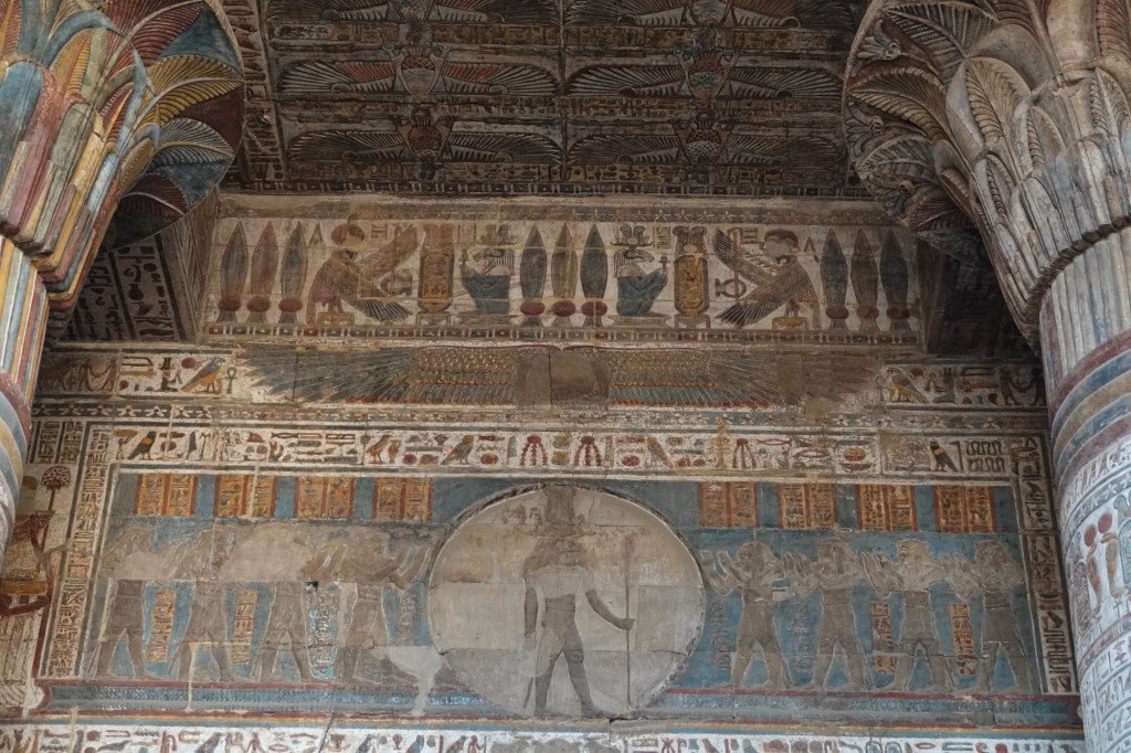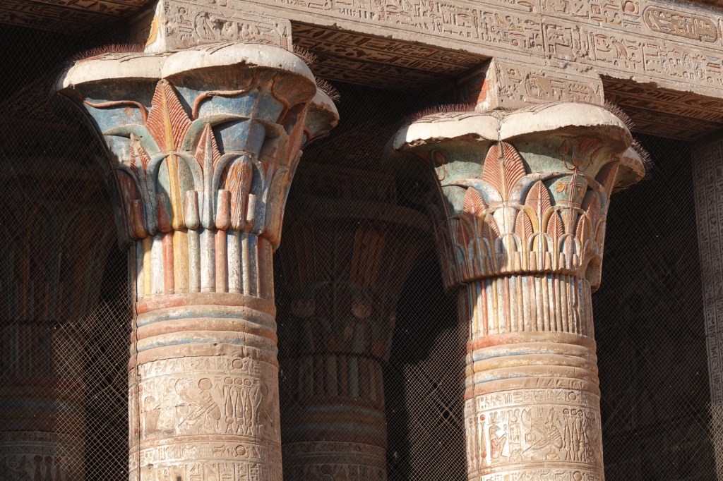 The colours on the exterior of the temple are quite spectacular, with the capitals on the columns, decorated in red and blue that is still unbelievably vibrant. The columns include designs of papyrus and lotus, representing upper and lower Egypt united as one.