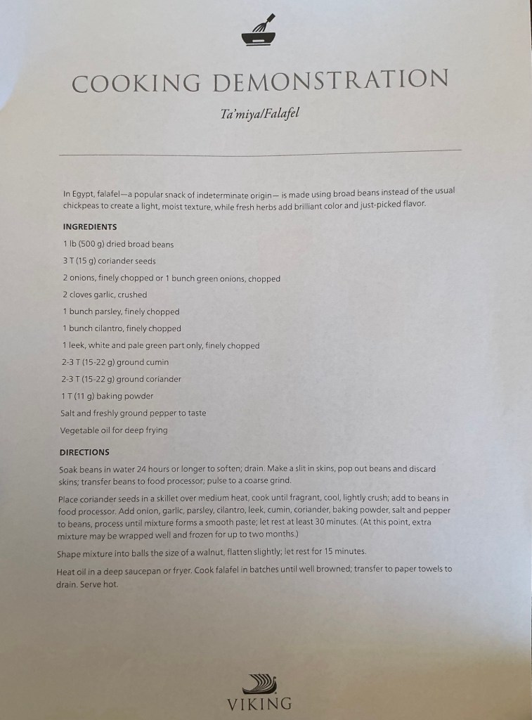 I’ve been really enjoying the falafel on board. Apparently the secret is using fava beans! Of all the countries in the Mediterranean and Middle East, Egypt is the only one that doesn’t use chickpeas. There’s also the addition of a bit of baking powder to make the end product fluffy. We also learned that the Ra is the only Viking Nile ship that makes their falafel from scratch!