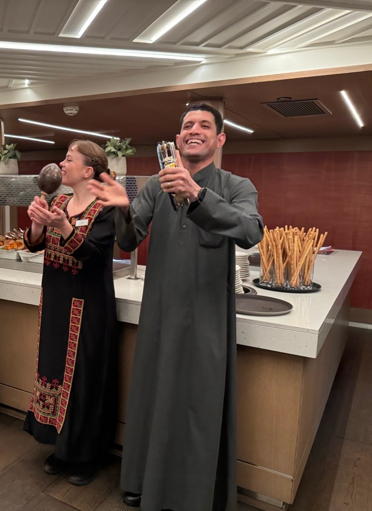Tonight was the cruise’s one Egyptian themed dinner, when everyone was encouraged to dress in Egyptian garb. I even convinced Ted to join in!