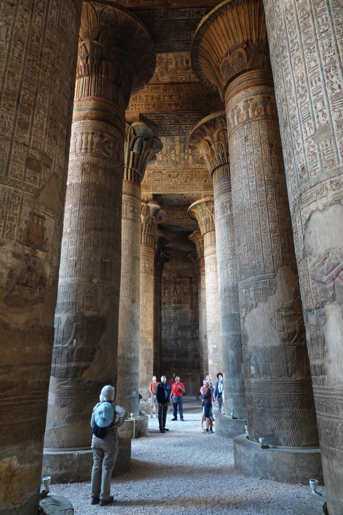 The temple at Esna was designed and built in the second century BCE during the Roman period. Nonetheless, it is truly an ancient Egyptian temple which depicts Egyptian gods not those of Rome. We walked about half a kilometre from our ship to the temple, but at the time of its building, this temple would have been right on the bank of the river.