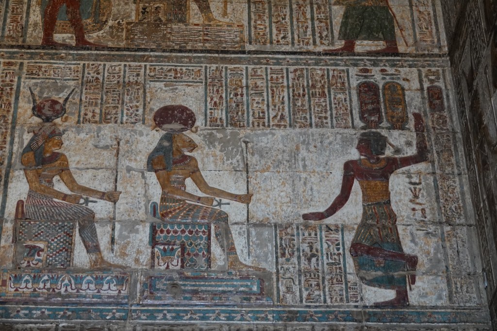 The spectacular reliefs on the interior of the temple include the first known depiction of a pharaoh dancing, in this case in front of the goddesses Hathor and the Sekhmet.