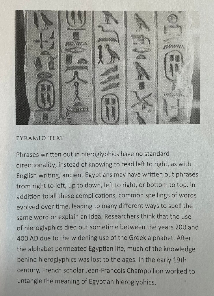 Before lunch, Walid gave a talk about hieroglyphics. He reminded is that no one today, not even the most famous professors, can read hieroglyphics with 100% accuracy; the best scholars can claim is about 80%.