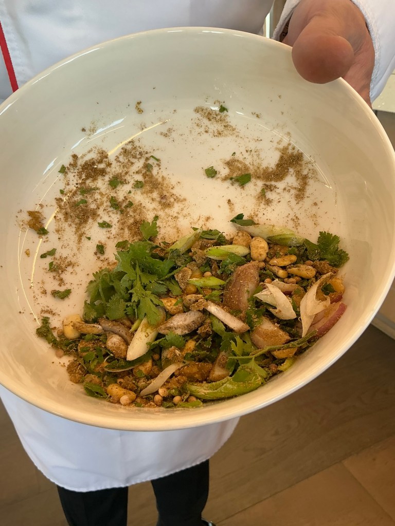 We had some lovely travel related conversation over lunch, and then a bit of relaxing with my glass of very tasty Egyptian white wine (Omar Khayyam Sultanine Blanche blend) before the afternoon cooking class.