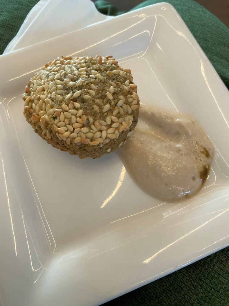 Chef’s finished product, garnished with tahini. Crispy outside, and soft and delicious inside. Yum.