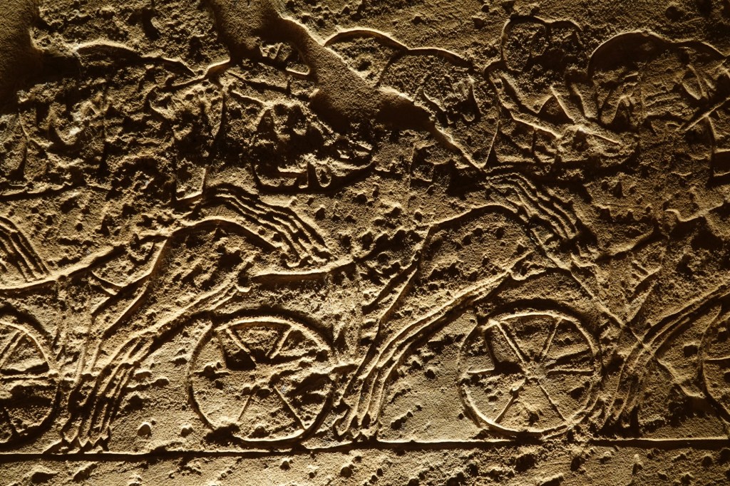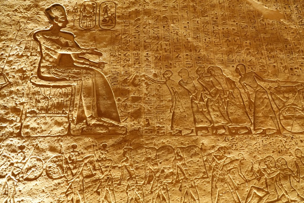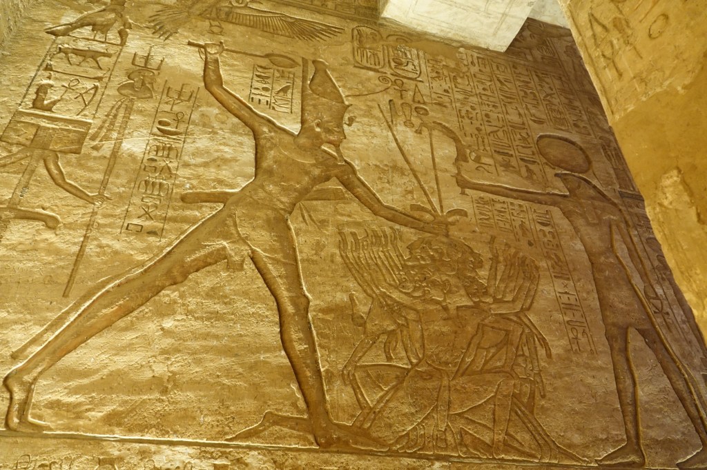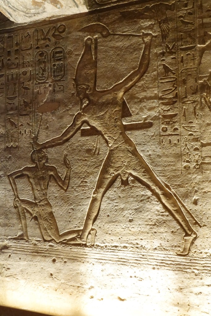 The carvings here depict the war between Egypt and the Hittites (modern day Syria), ending in the signing of the first ever recorded peace treaty, the text of which was found on one of the walls in the Karnak temple complex. Subsequent tiers of carvings depict war preparations, capture of spies, Rameses II both in his chariot and on his throne, the Hittite defeat, Rameses II killing the Hittite leader, and the pharoah attacking the Hittite fortress.