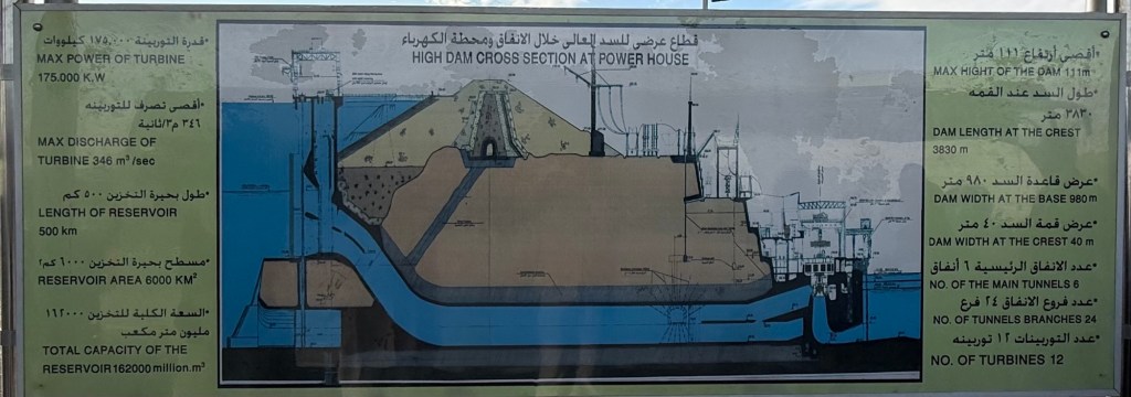 There are 6 tunnels each with 2 turbines which originally supplied almost 60% of Egypt’s clean power; now the percentage is much lower since there are lots of other clean power sources (solar and wind).