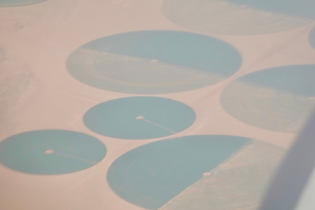 Our 35 minute flight to Abu Simbel was on Egypt Air, giving us a bird’s eye view of Lake Nasser, as well as a glimpse into the new fertile valley being created thanks to water availability. The green circles seen through our plane’s windows are in stark contrast to the arid sands of the Sahara. This is the Sharq El Owainat (East Oweinat) development of agricultural fields created using a modern farming method called center-pivot irrigation. They look like something from an Edward Burtynsky photo exhibition.