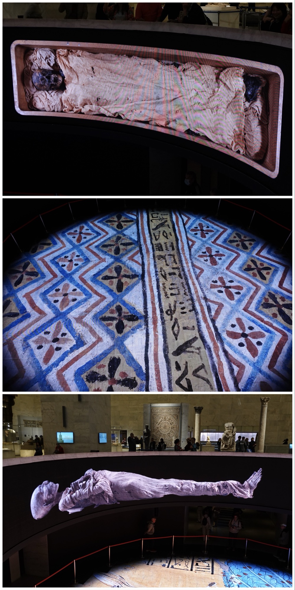 In the centre of the main floor in a huge rotunda below a pyramid shaped ceiling is an area where images are projected onto the floor and around the outside of the circle. Those images include pictures of the mummies, pictures of tombs, pictures of Egyptian archeological sites, and pictures of ancient artefacts.