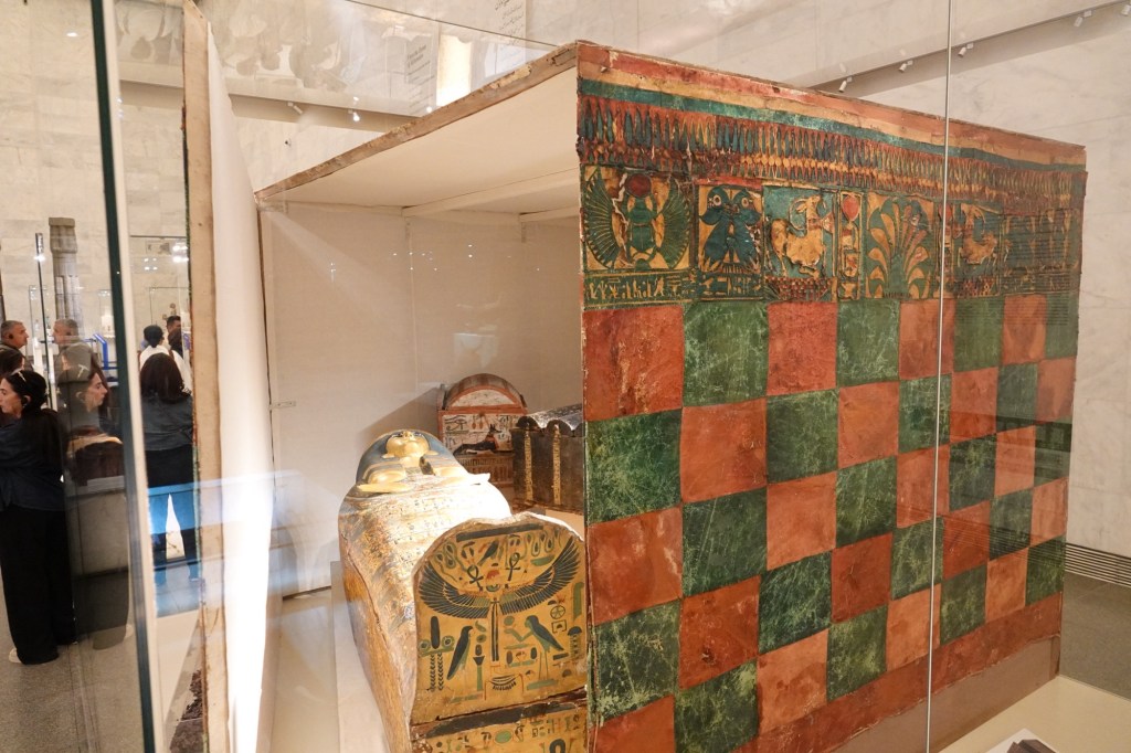 In each chamber, there was typically at least one of the pharaoh’s nested coffins on display, as well as the mummy of the pharaoh himself or herself. On one of the 4 walls, there was always a large brass plaque outlining the pharaoh’s accomplishments during their reign.