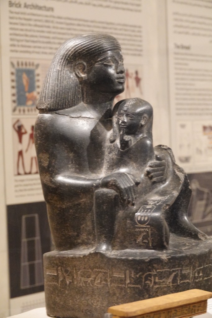 The black granite statue from about 1500BCE is of Sekhmut, the architect who loved Pharoah Hatshepsut and built her what became her mortuary temple. He is depicted as a child on his mother’s lap.
