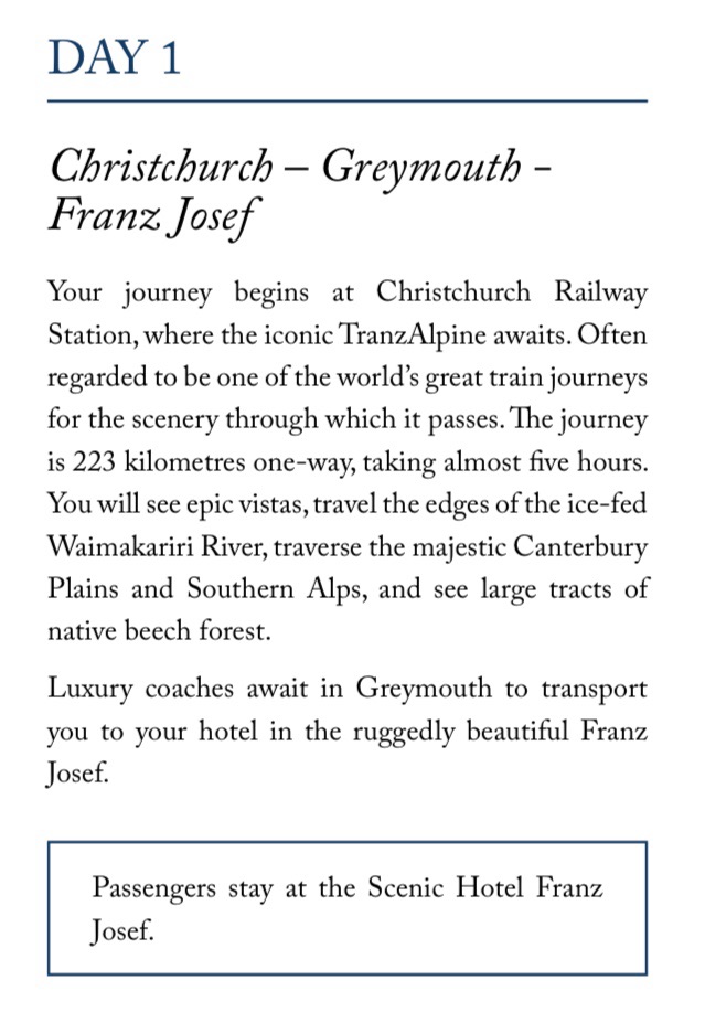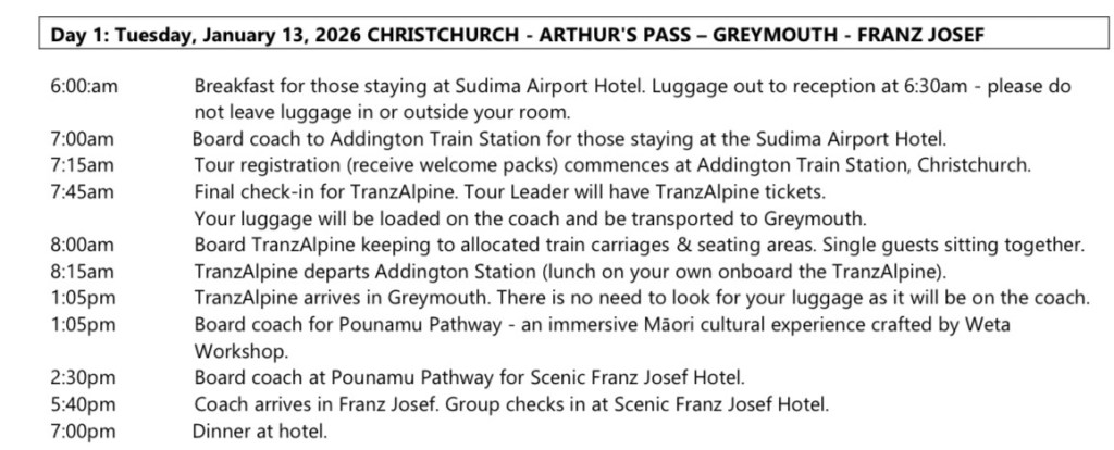 1. This trip sounds wonderful. I love that it covers most of the island and covers all kinds of travel. We did a land tour of New Zealand about 10 year ago and stayed at the Hermitage Hotel in Mt. Cook. I do remember that the view was wonderful. Enjoy and I love following your adventure.