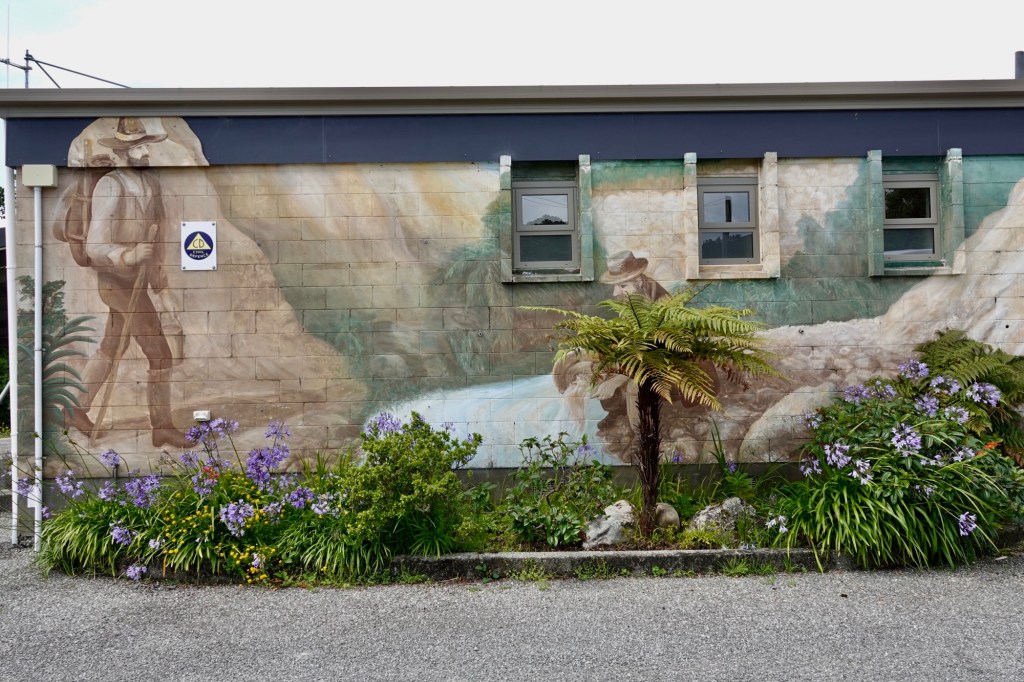 We had a brief comfort stop in Ross, where the mural on the tiny community centre pays homage to the town’s gold-mining past.