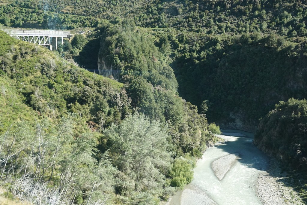 Broken River Viaduct is 55 metres above the Broken River, a tributary of the Waimakariri. The steel portions were supplied by the Cleveland Bridge and Engineering Company and fitted together on site in 1906, a bit like a Meccano set. It took two years for the concrete piers to be poured and settled.