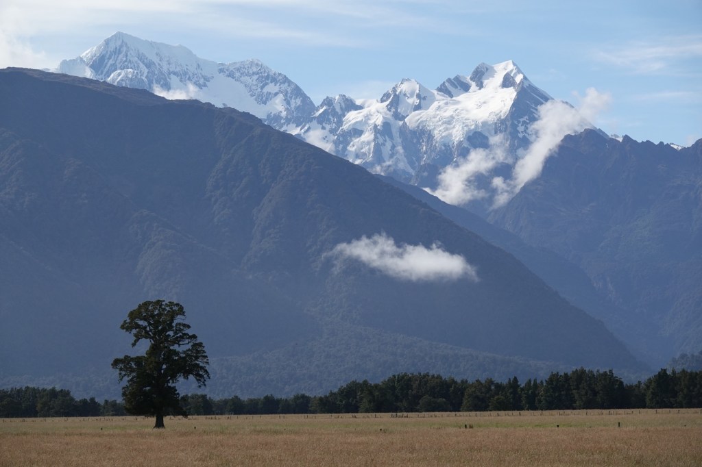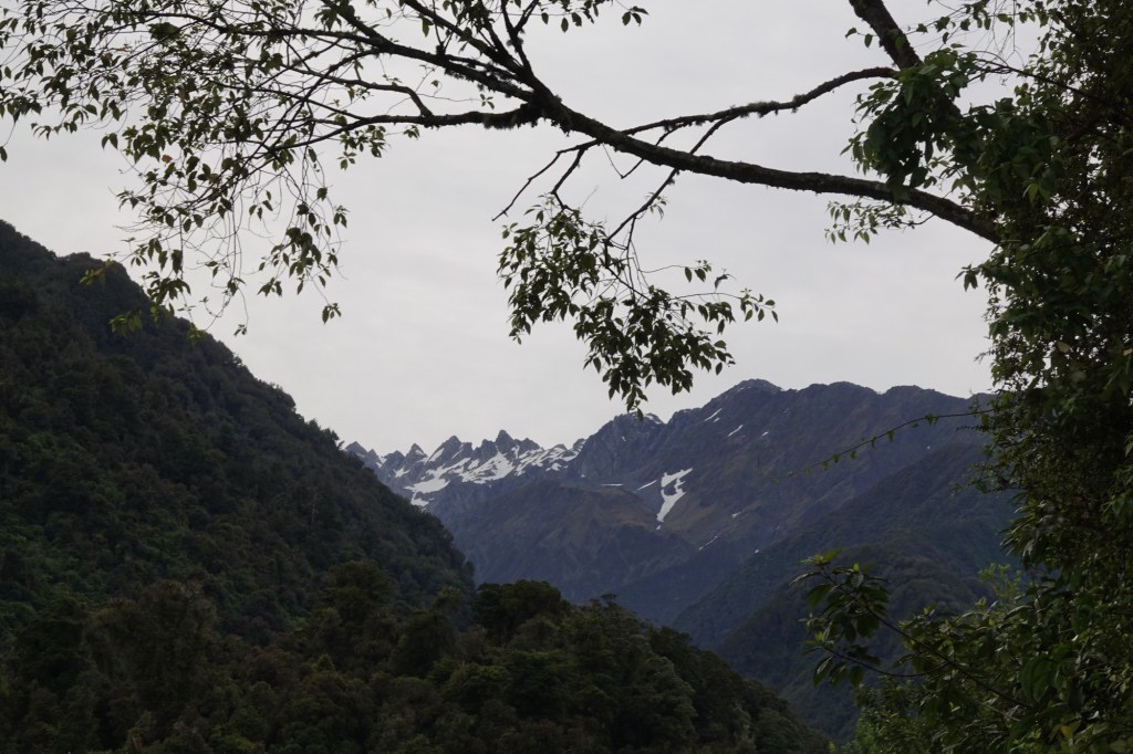 The Haast Pass is the lowest of the passes across the Southern Alps; Arthur’s Pass that we crossed by train two days ago is the highest. When we crossed the top of the Haast Pass today, the topography almost immediately changed from the lush green rainforest of the west coast to mountain beech forest. Suddenly there were no huge tree ferns!