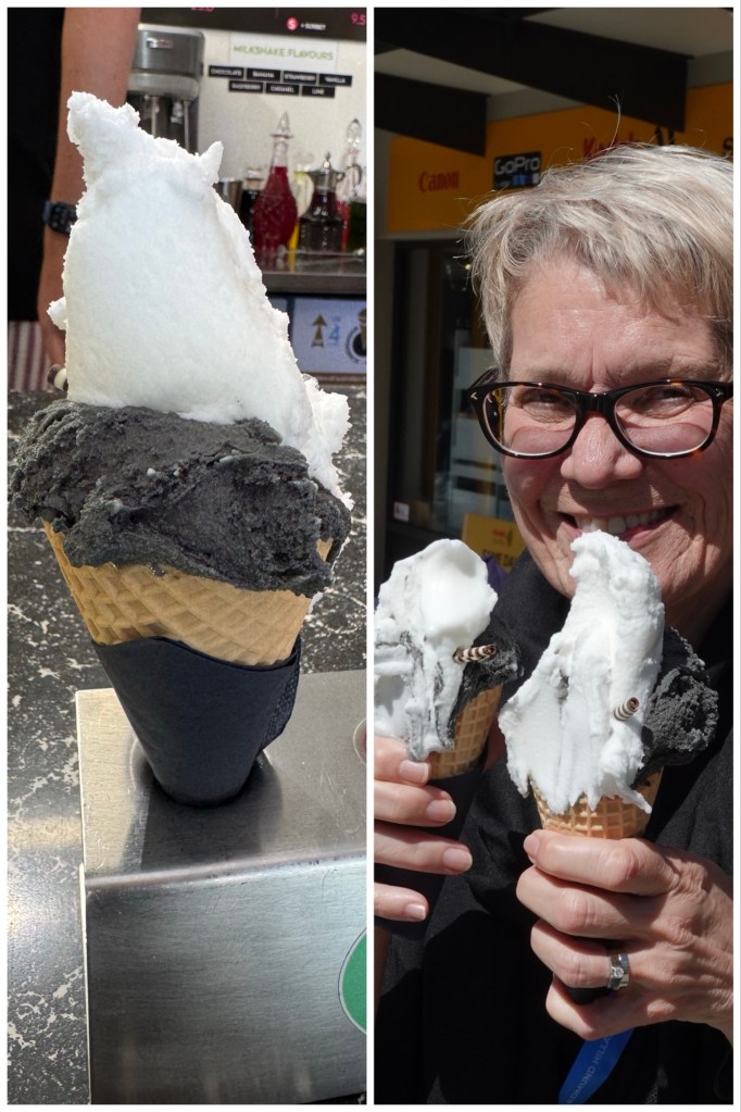 In Wānaka Township we made an ice cream stop to counteract the venison mac and cheese. Black Peak gelato shop had the absolutely choice flavours. Ted and I both had black liquorice with actual liquorice chunks in it, and tart lemon. Scrummy!!!!